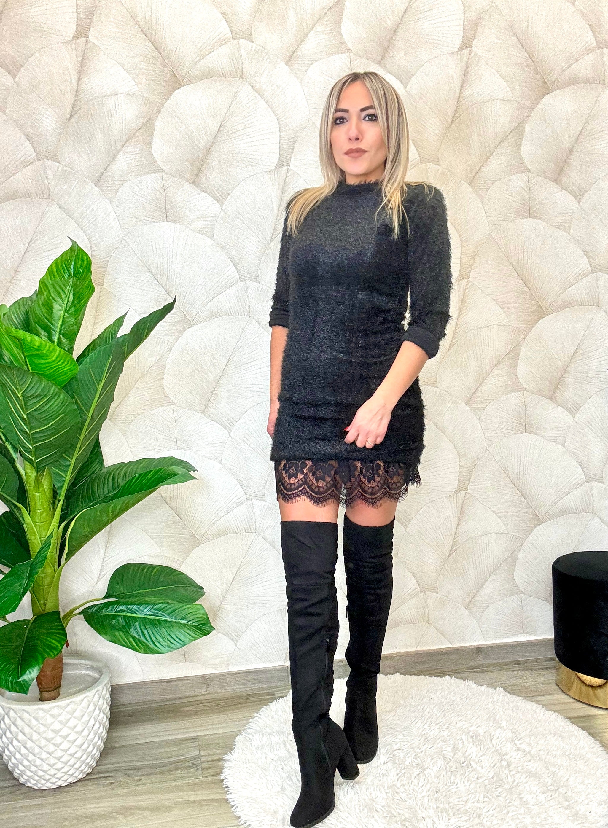 Abitino in viscosa, tessuto esterno pelliccetta, disponibile in taglia unica ma estremamente elastico, si adatta bene dalla XS alla L, caratterizzato dal sottogonna in pizzo. La modella in foto veste taglia S ed è alta 165 cm