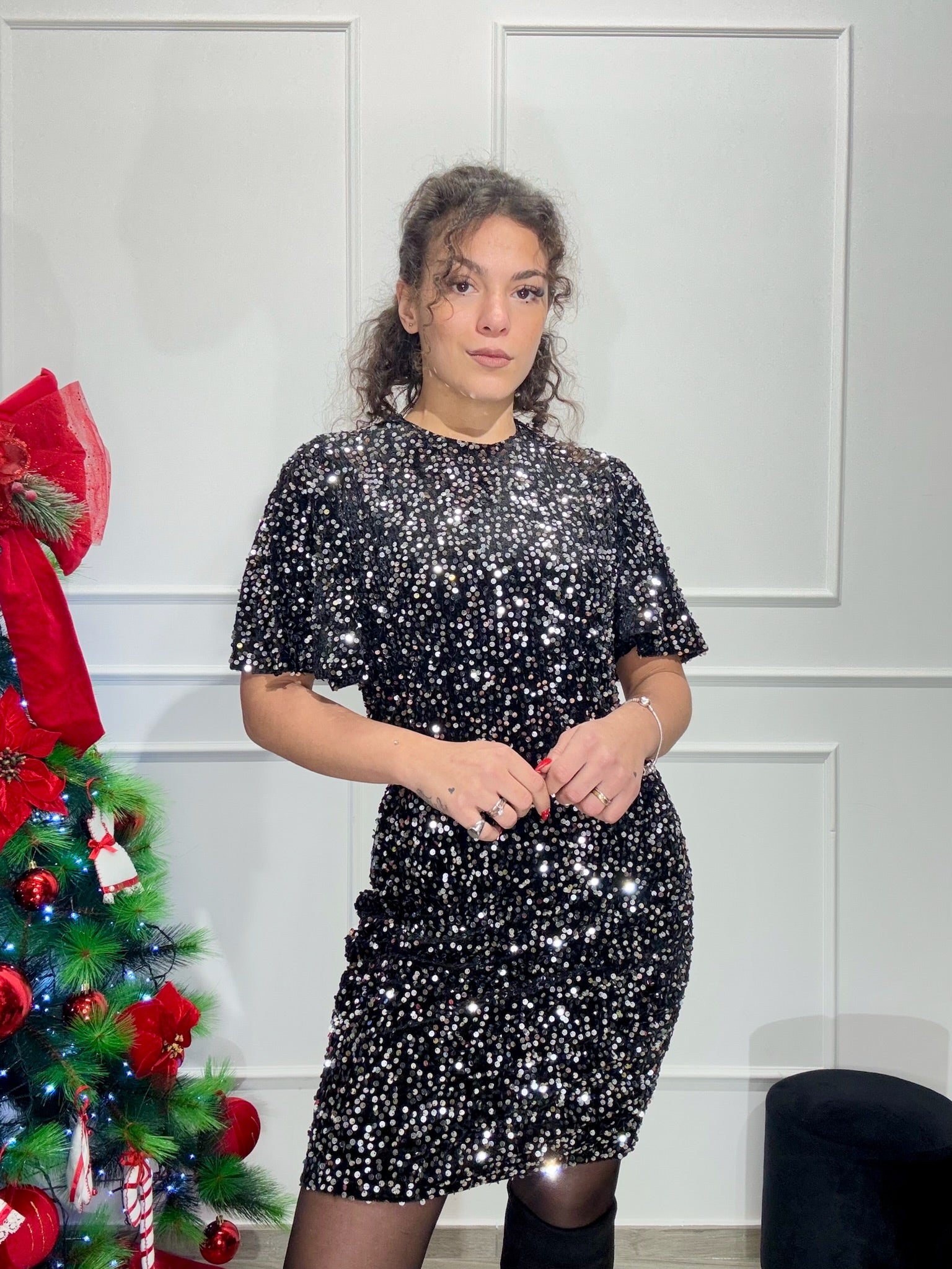 Abito linea morbida in velluto ricoperto da paillettes, mezza manica ampia. Disponibile in taglia unica ma con un ottima vestibilità dalla XS alla L. La modella in foto veste tg. XS