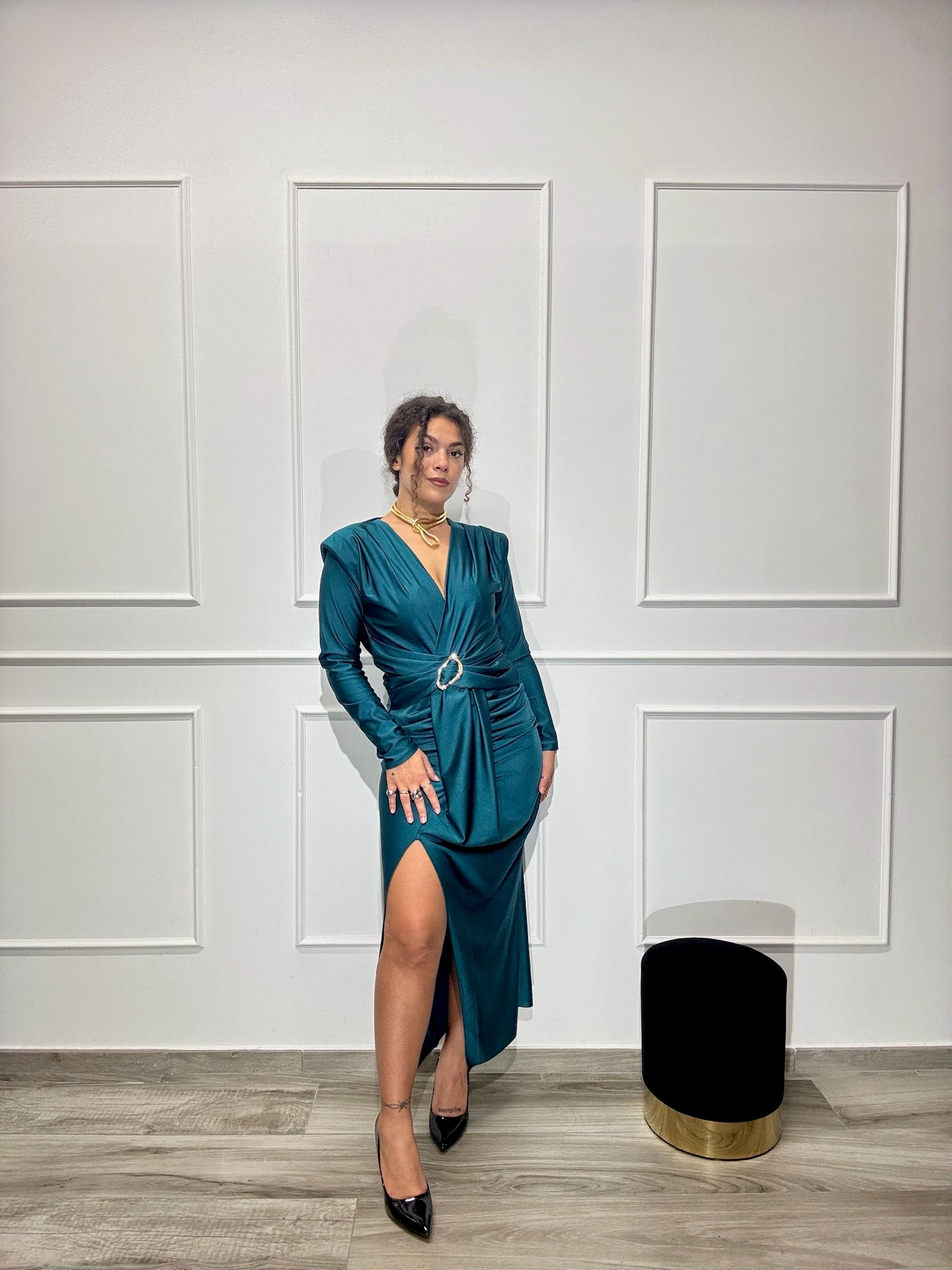 Abito in licra con spacco e drappeggio sul davanti, dettaglio in oro sullo scollo, spalline incorporate