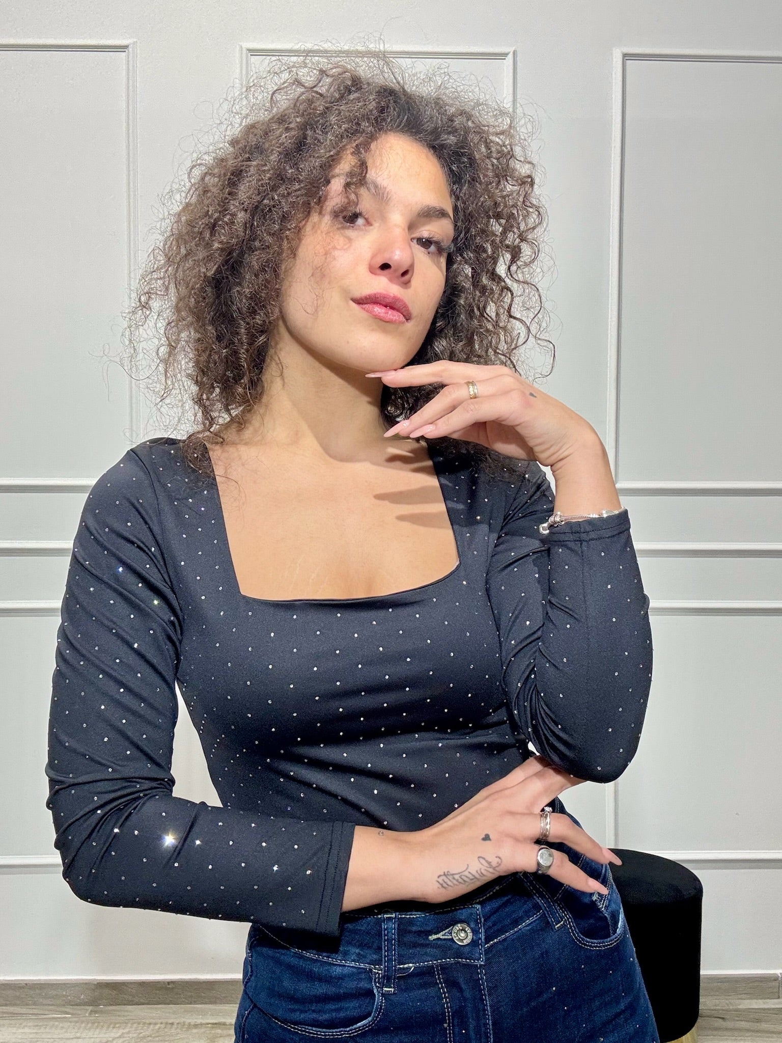 Body in licra con scollo quadrato impreziosito da punti luce sul davanti, disponibile in taglia unica ma con un ottima vestibilità dalla XS alla L. La modella in foto veste tg. XS