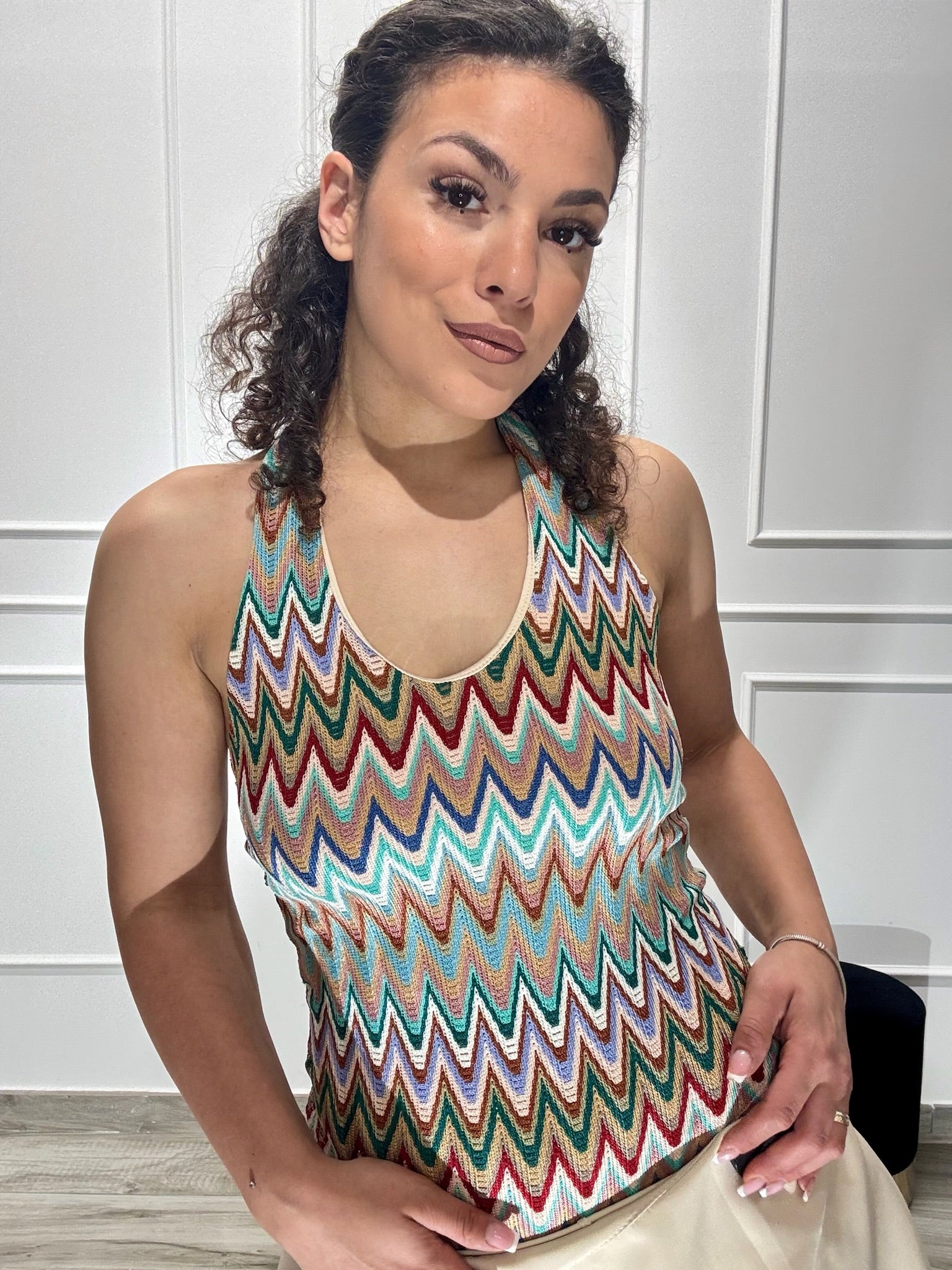 Body in tessuto traforato, fantasia spigata con scollo all’americana, tessuto elastico