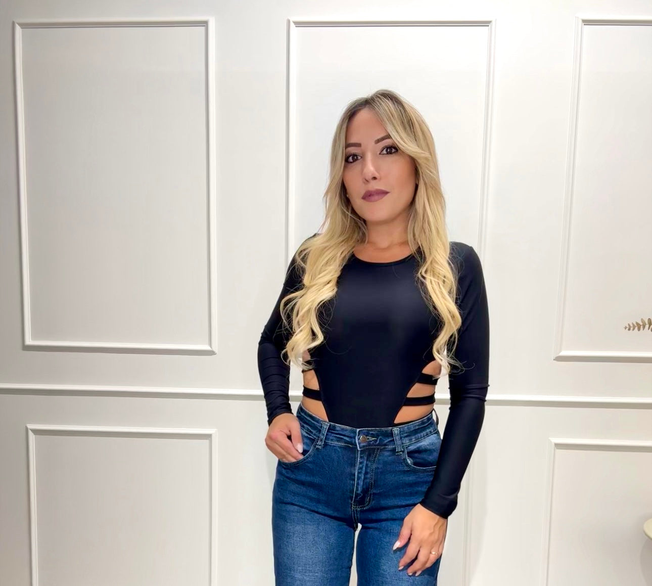 Body in licra con aperture laterali, girocollo. Disponibile in tGlia unica ma con un ottima vestibilità dalla XS alla M. La modella in foto veste tg. S ed è alta 165 cm.