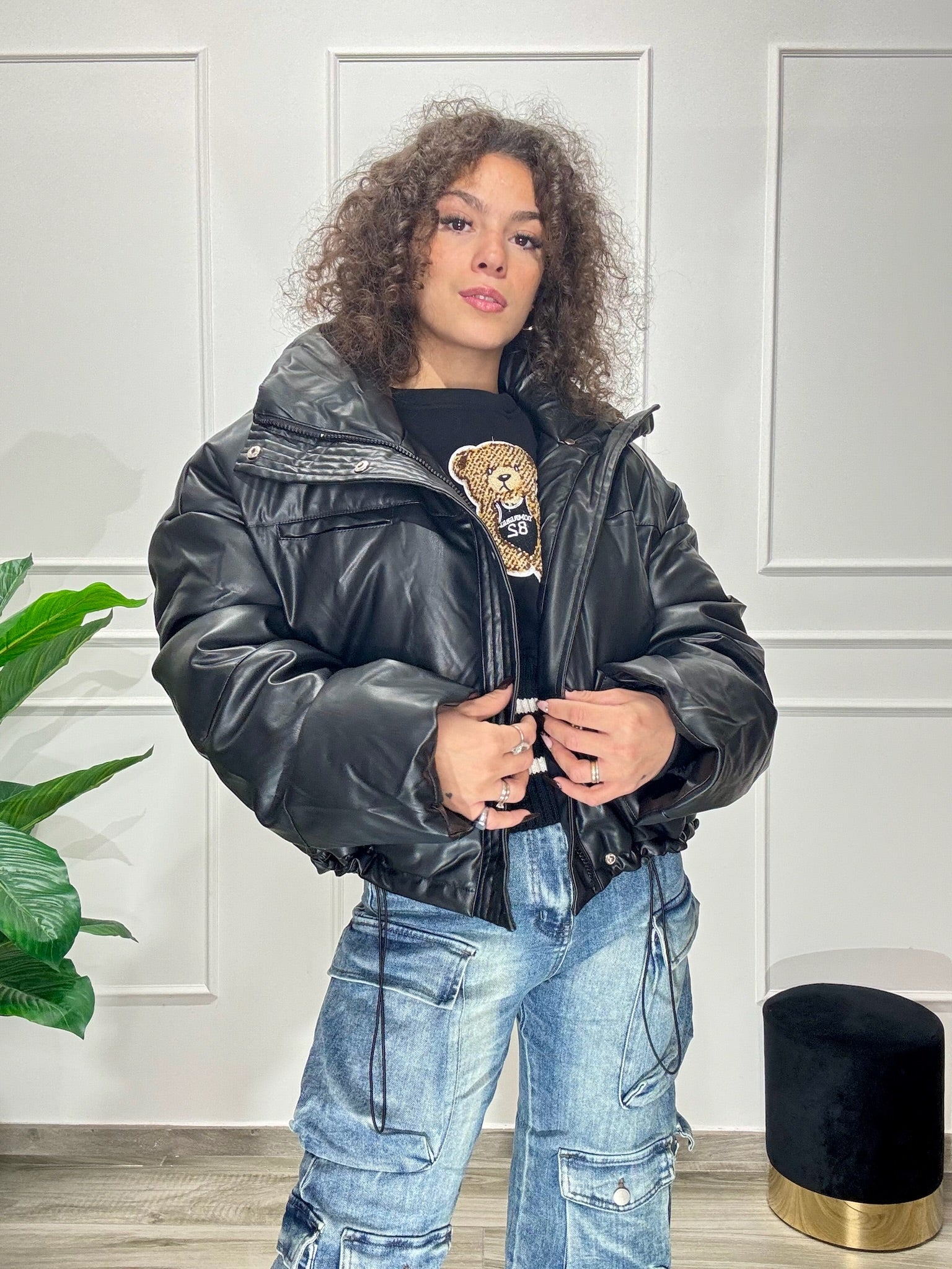 Bomber modello oversize in ecopelle con zip e bottoni. Coulisse regolabile. Disponibile in taglia unica con un ottima vestibilità dalla XS alla XXL