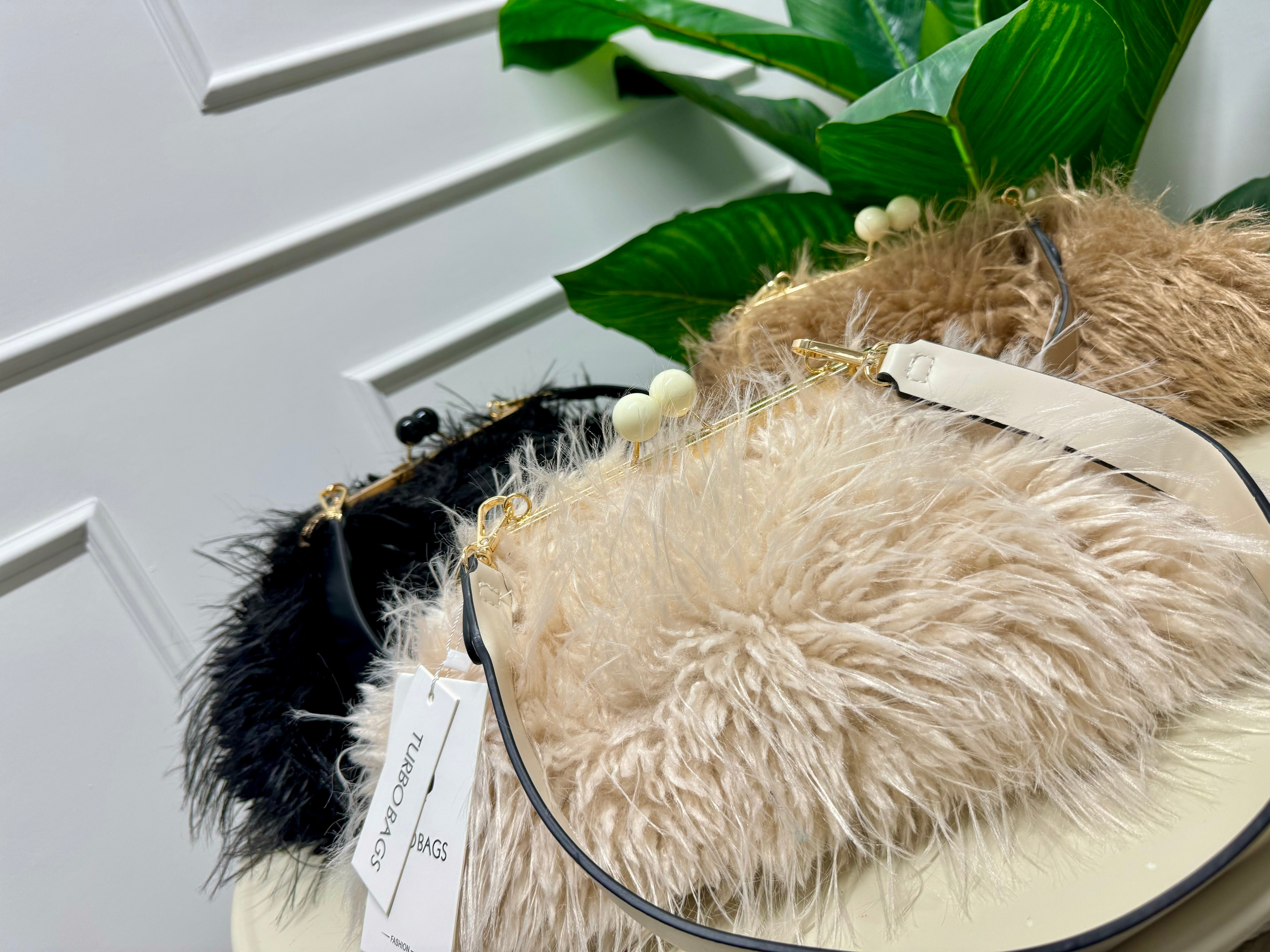 Borsa rivestita in piume sintetiche con chiusura clic clic. Doppia tracolla in ecopelle inclusa. Misura media