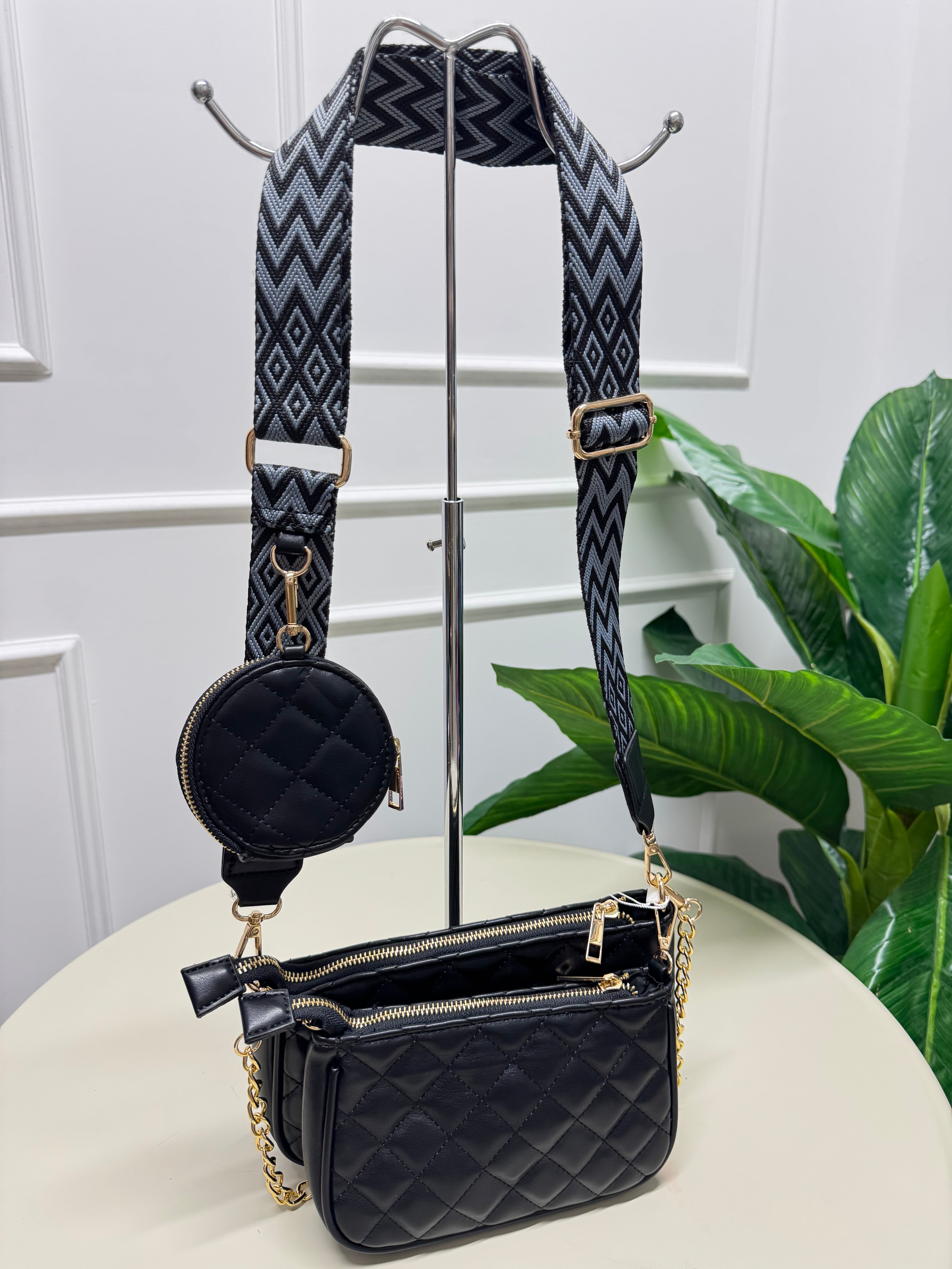 Borsetto due in uno a tracolla larga, divisibili. Disponibile con dettagli oro e argento