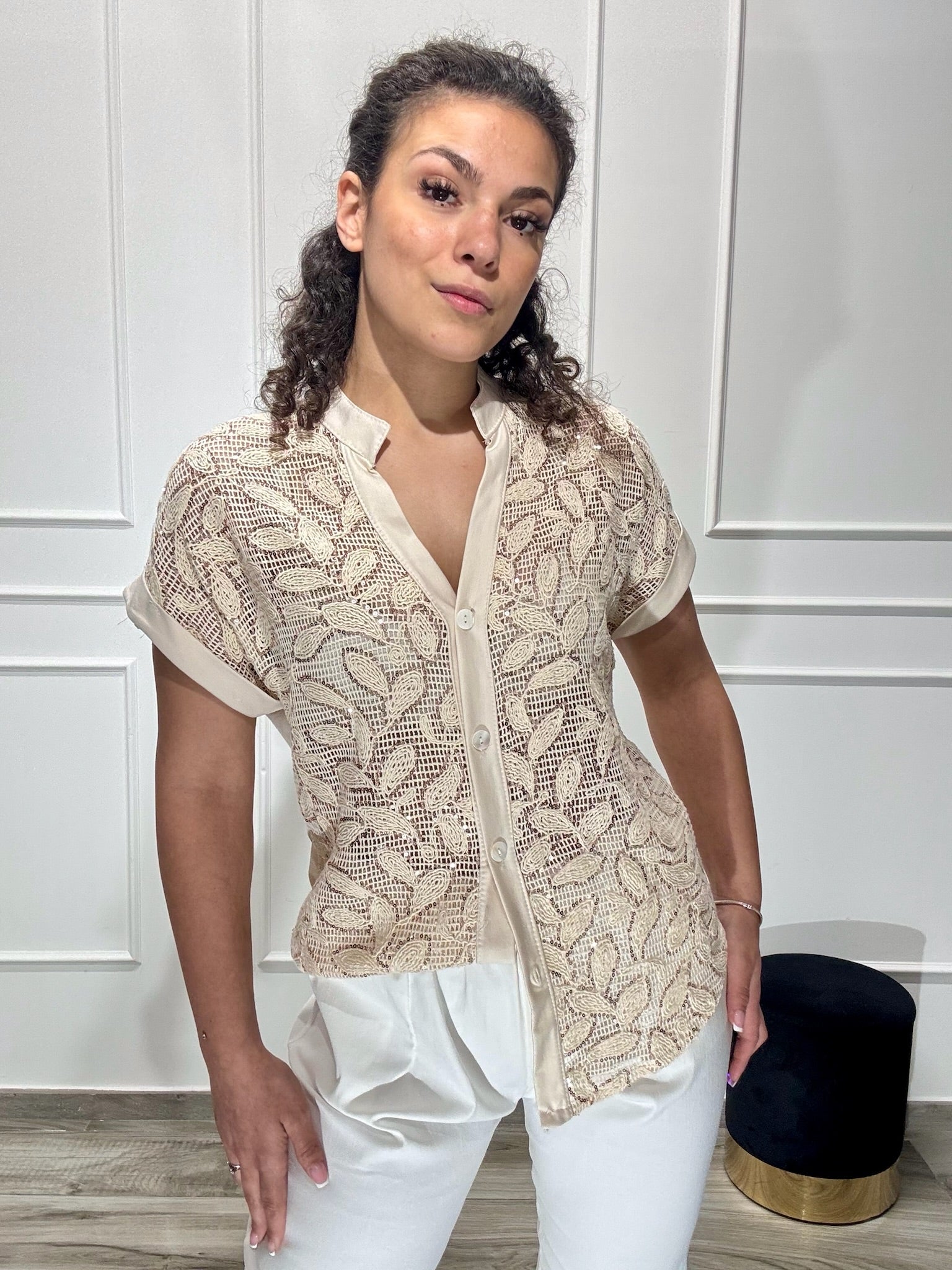 Cmicia in cotone , sul davanti in trasparenza ricamata con paillette, tessuto elastico