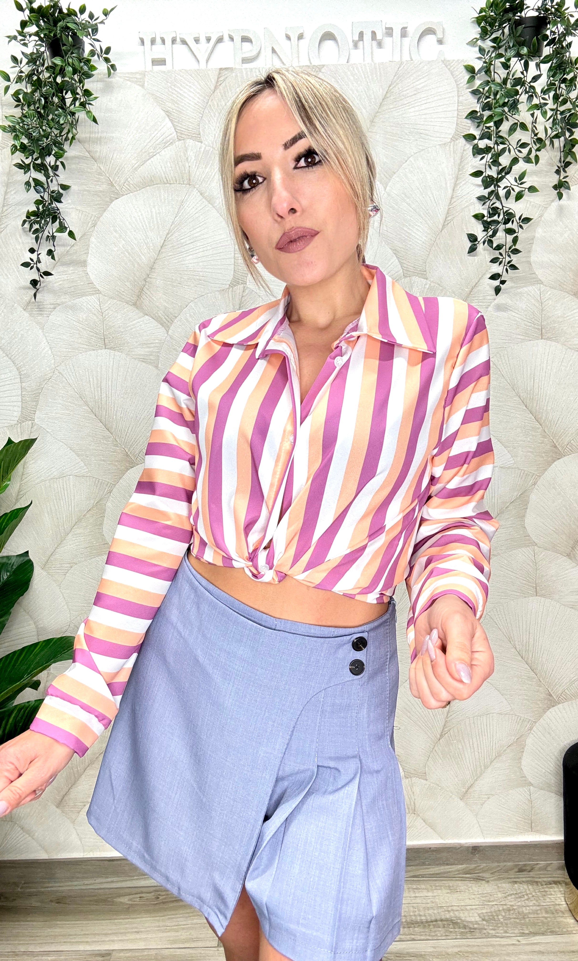 Camicia motivo a righe, lunghezza regolare, possibilità di annodarla sul davanti. Disponibile in taglia unica ma con un ottima vestibilita dalla XS alla L. La modella in foto veste tg. S