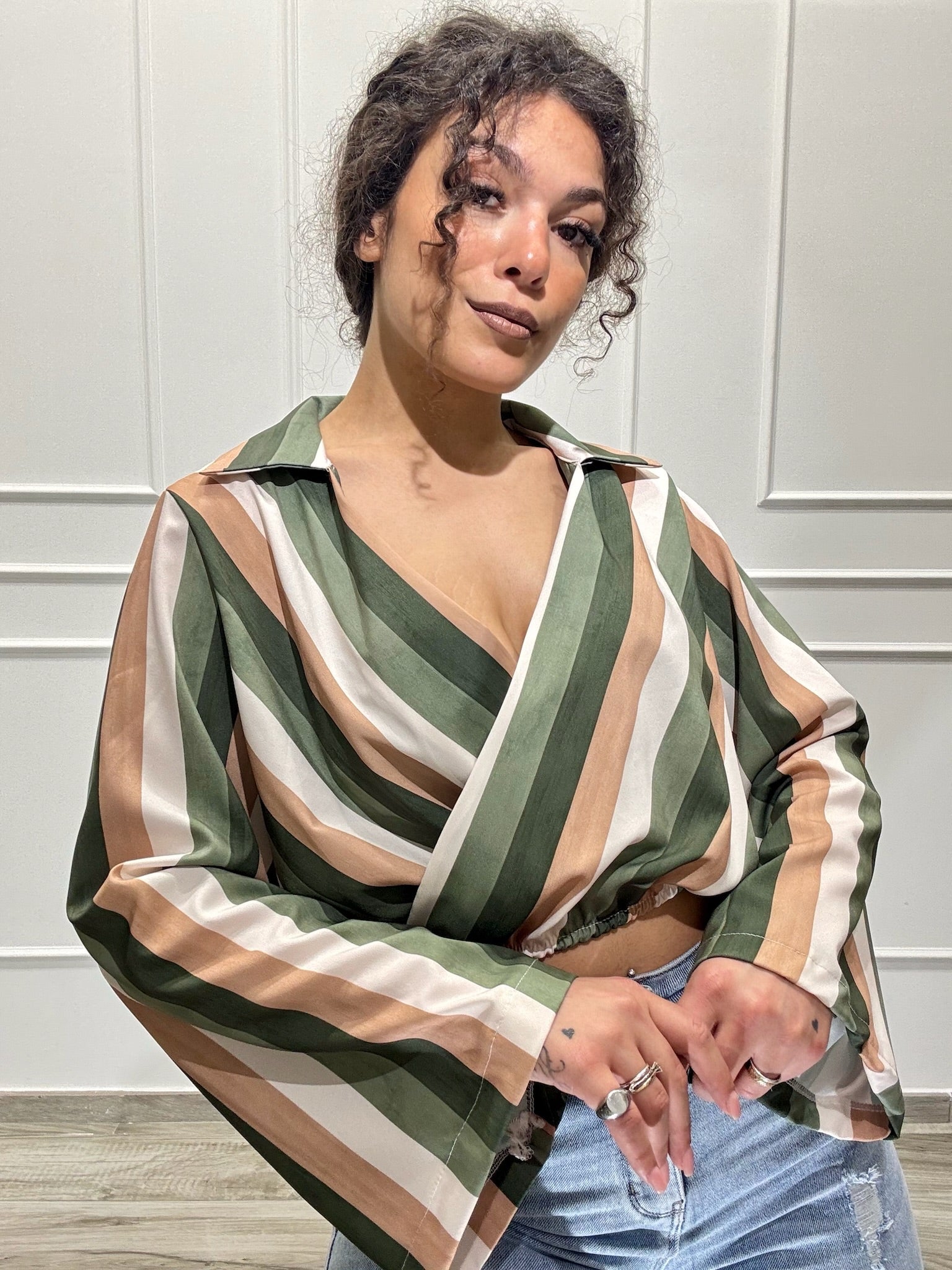 Camicia scollo a incrocio modello crop con elastico in vita e manica a zampa