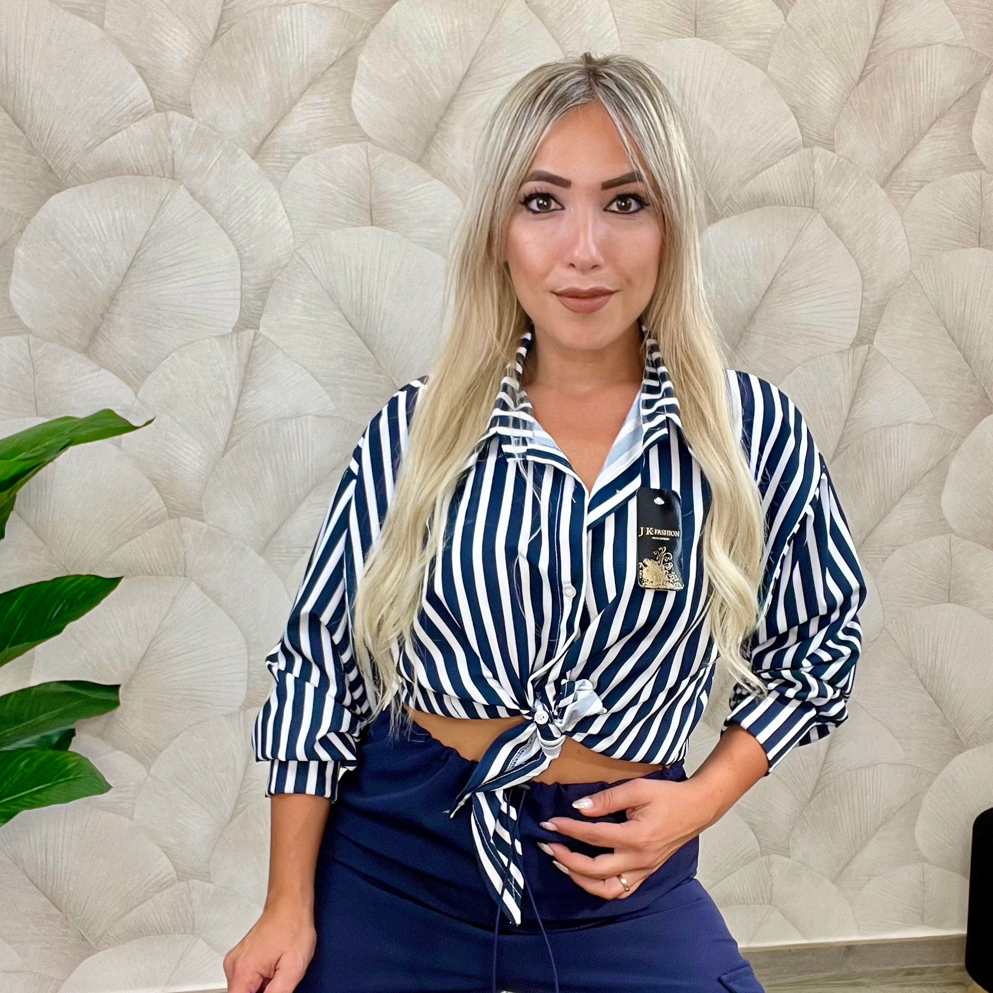 Camicia rigata di design crop con nodo, taglia unica che si adatta magnificamente a tutte le misure dalla XS alla XL.