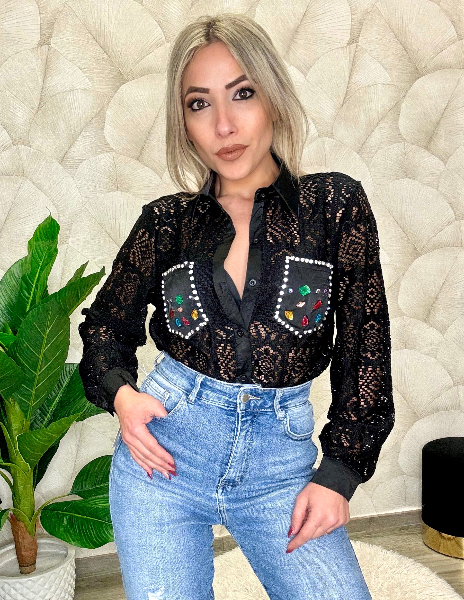 Camicia interamente ricamata con bordi e taschini in raso impreziosita da pietre colorate e strass, lunghezza regolare, disponibile in taglia unica ma con un ottima vestibilita dalla XS alla L essendo un tessuto elastico. La modella in foto veste tg S ed è alta 165 cm.