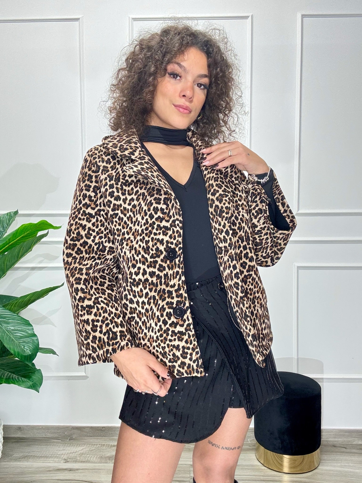 Giacca modello cappa fantasia animalier. In tessuto neoprene. Disponibile in taglia unica ma con un ottima vestibilità dalla XS alla XL. La modella in foto veste tg. XS