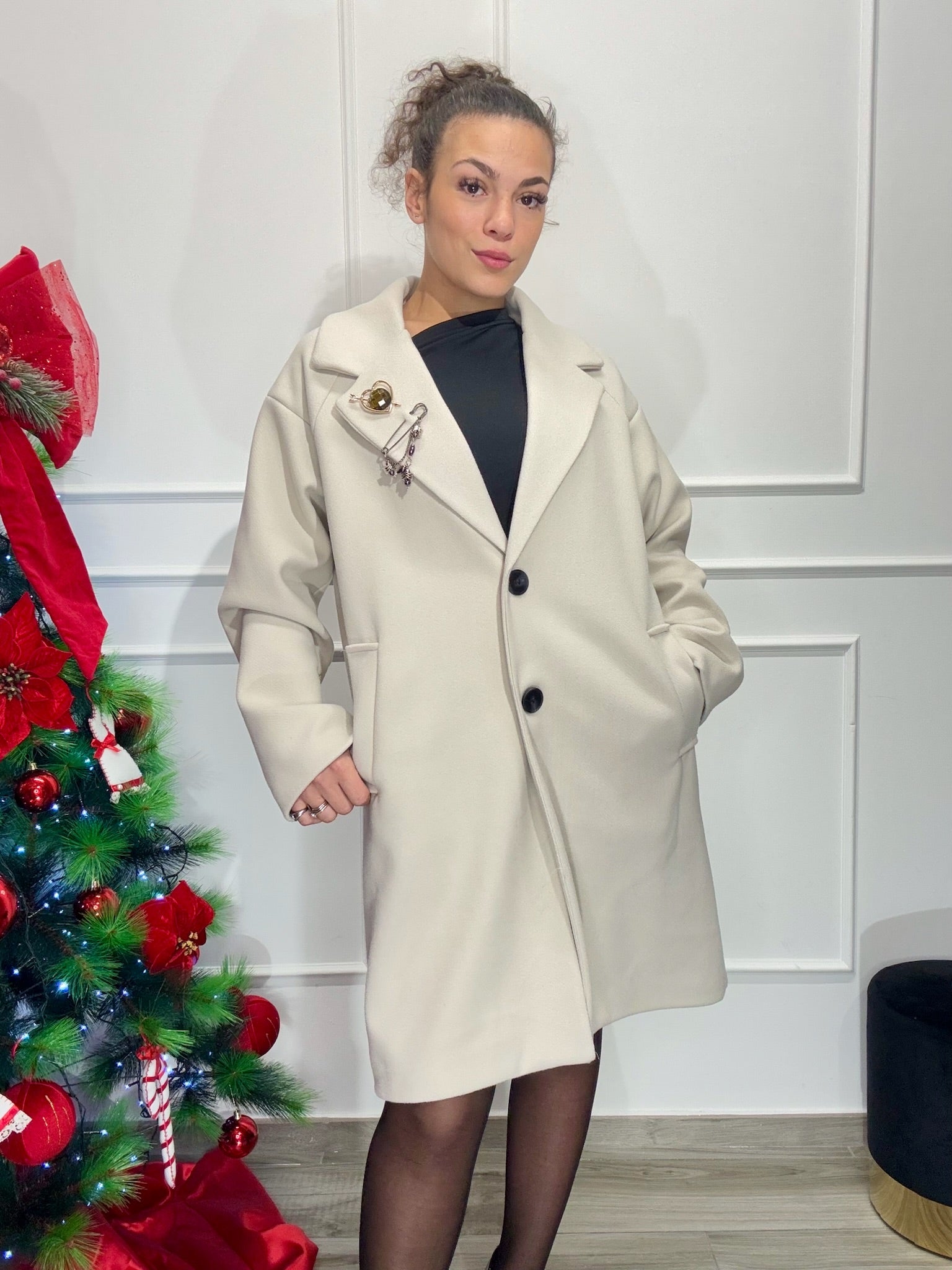 Cappottino internamente foderato, mezza lunghezza, spille rimovibili sul rever. Disponibile in taglia unica ma con un ottima vestibilità dalla XS alla XL. La modella in foto veste tg. XS