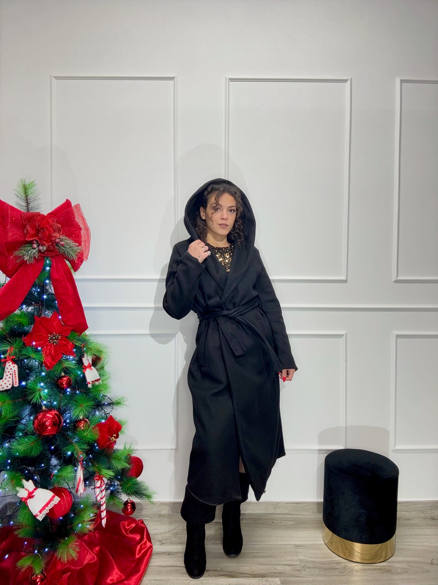 Cappottino foderato con cappuccio e cintura in vita. Disponibile in taglia unica ma con un ottima vestibilità dalla XS alla XL. La modella in foto veste tg. XS