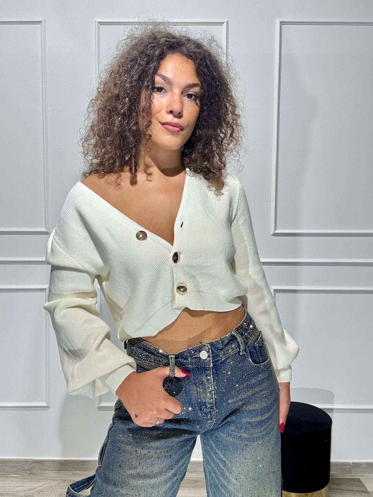 Cardigan modello crop con bottoni dorati in viscosa, adatto per l’inverno