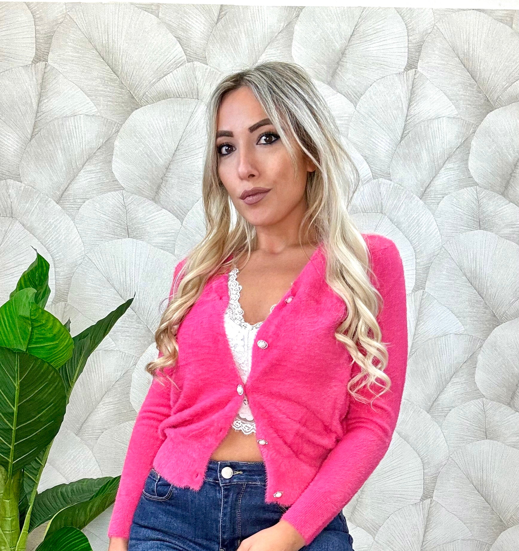 Un cardigan in morbida pelliccia con bottoni in perle e strass, capace di adattarsi a qualsiasi corporatura dalla XS alla L. Taglia unica, la modella che lo indossa è alta 165 cm ed è taglia S.