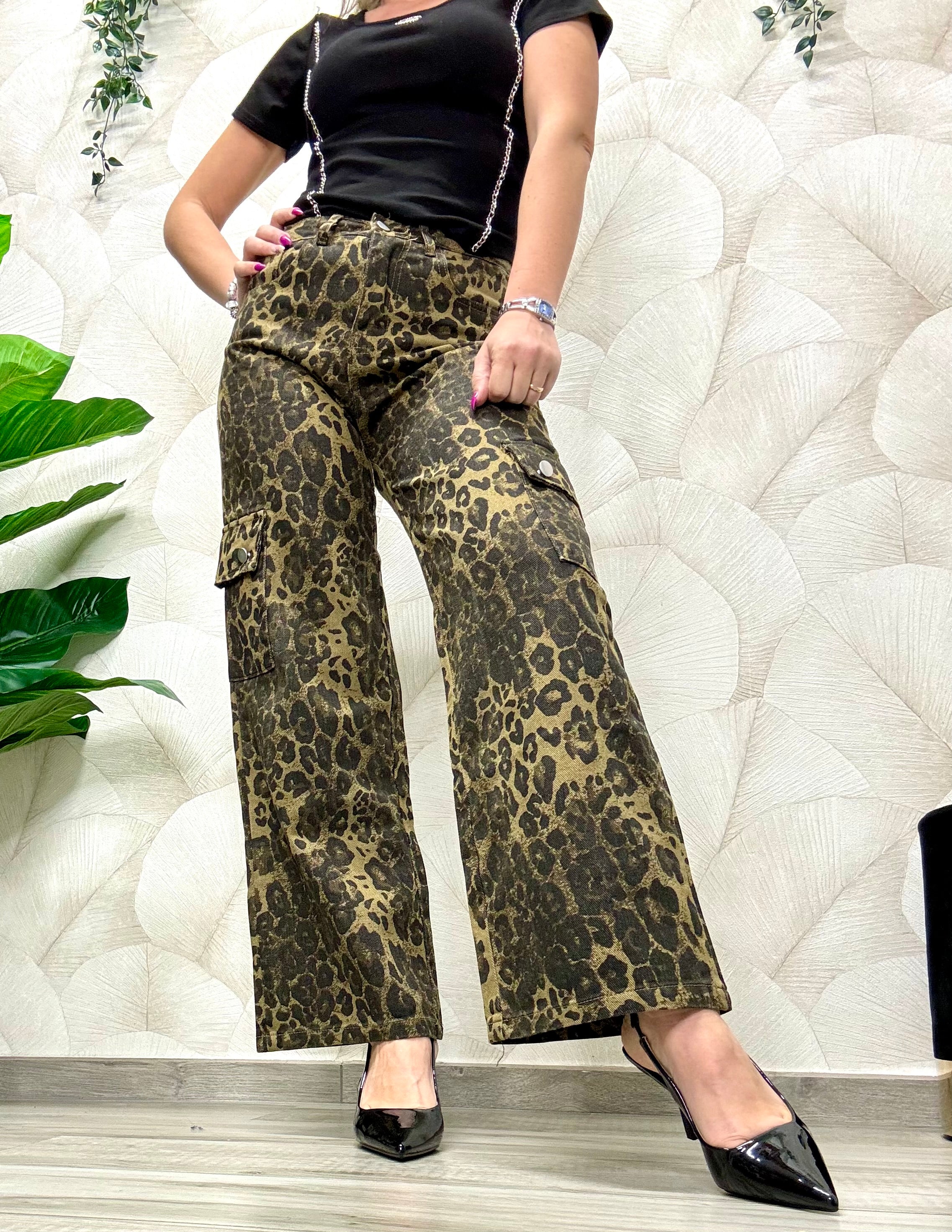 Jeans cargo fantasia animalier, vita alta tessuto fermo, vestibilità regolare. La modella in foto indossa tg. S ed è alta 165 cm.