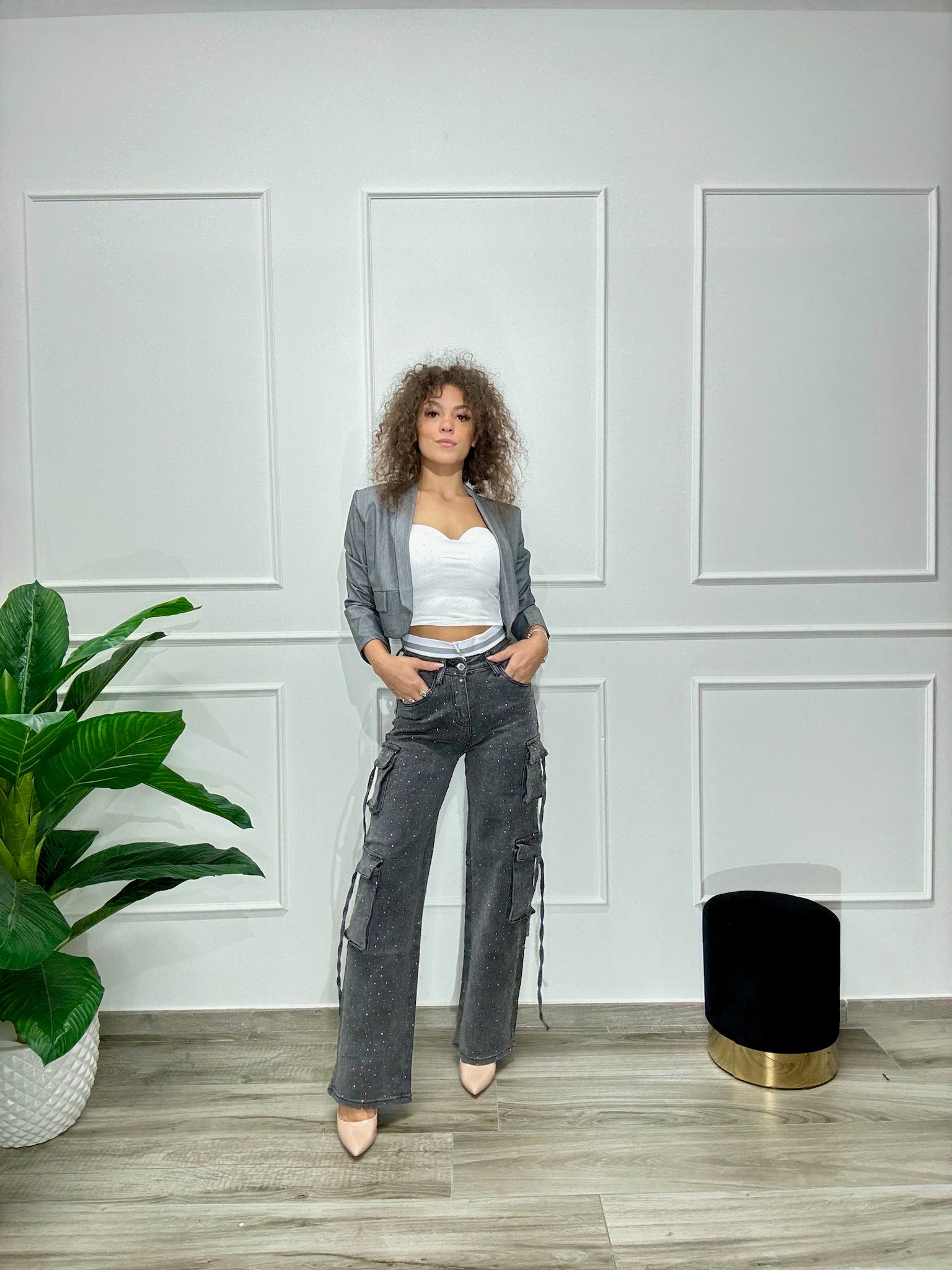 Jeans cargo Grigio con bordino elastico bicolore, punti luce su ogni parte, tessuto elastico. Vestibilità regolare, la modella in foto indossa tg. Xs ed è alta 160 cm.