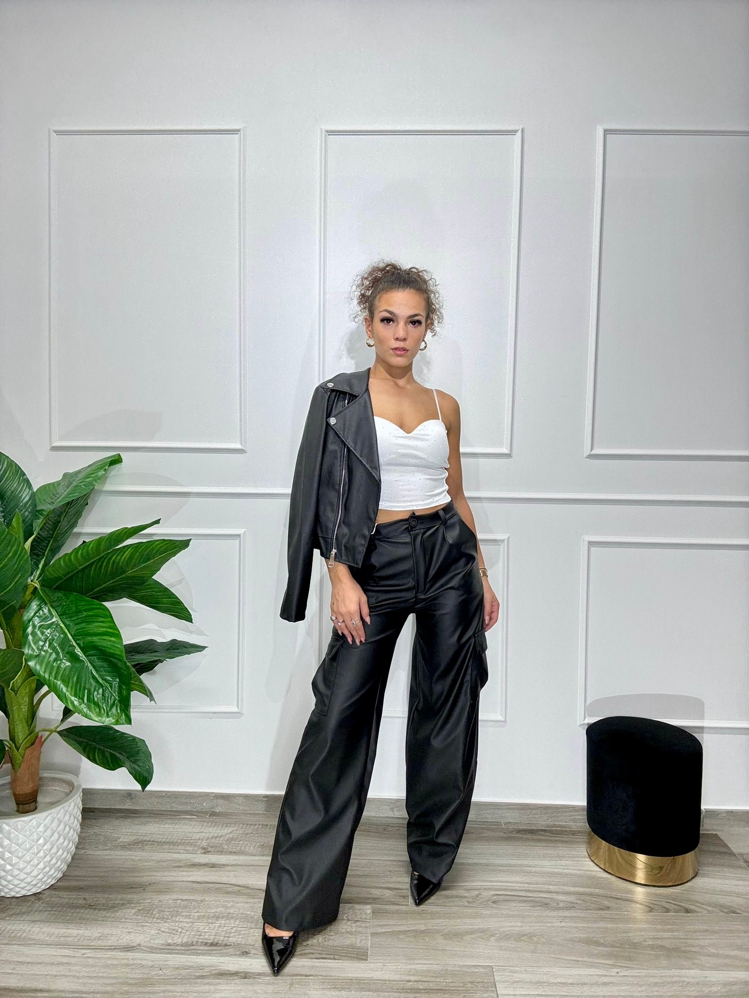 Cargo ecopelle, vita alta, tessuto elastico. La modella in foto indossa tg.S ed è alta 160 cm.