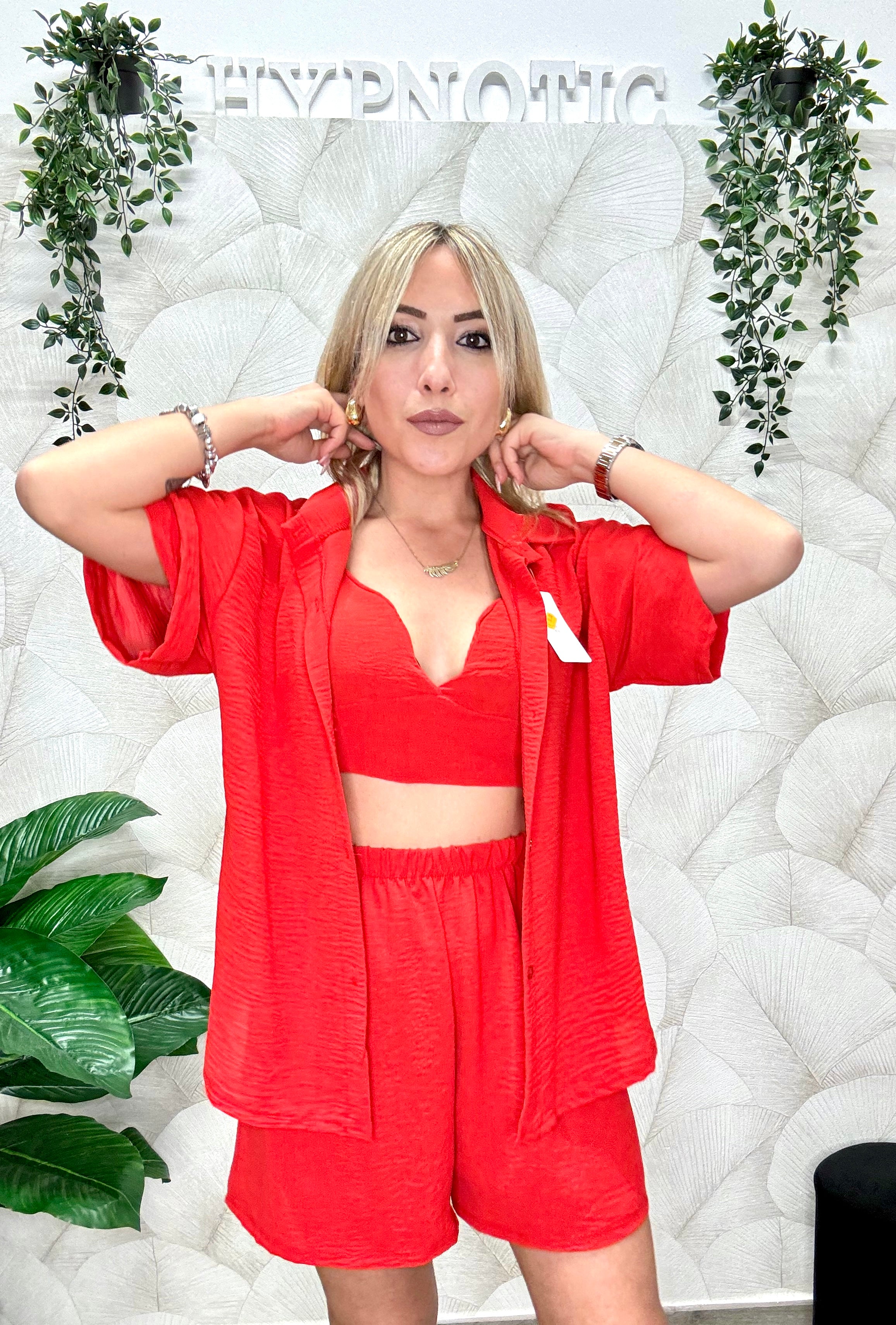 Coordinato composto da 3 pezzi, pantalone con elastico in vita, top con coppe preformate e camicia con bottoni, disponibile in taglia unica ma con un ottima vestibilità dalla S alla XL. La modella in foto veste tg. S