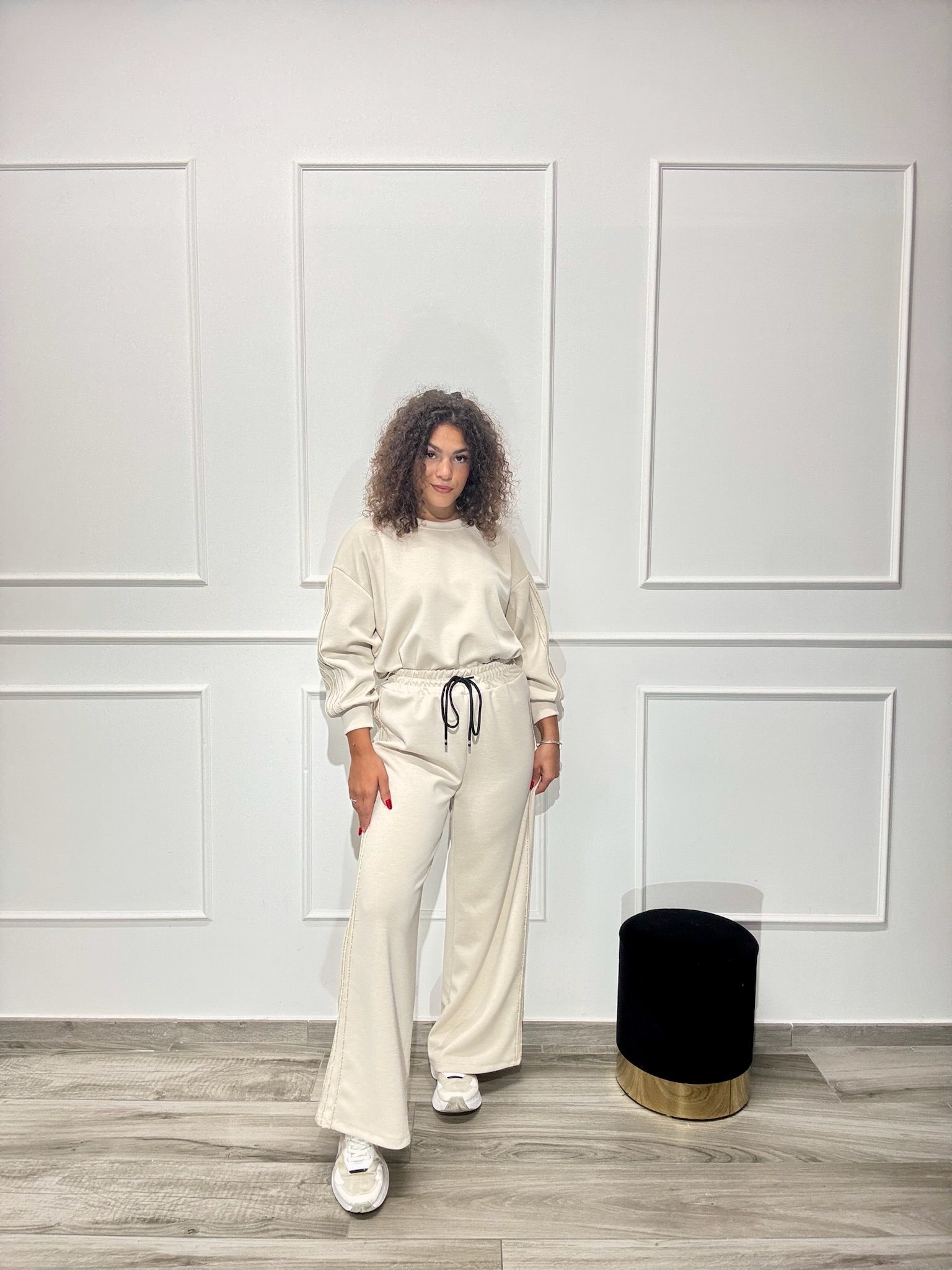 Coordinato composto da pantalone palazzo con elastico e coulisse in vita, stris e laterali dorate, in viscosa, adatto per l’autunno/inverno