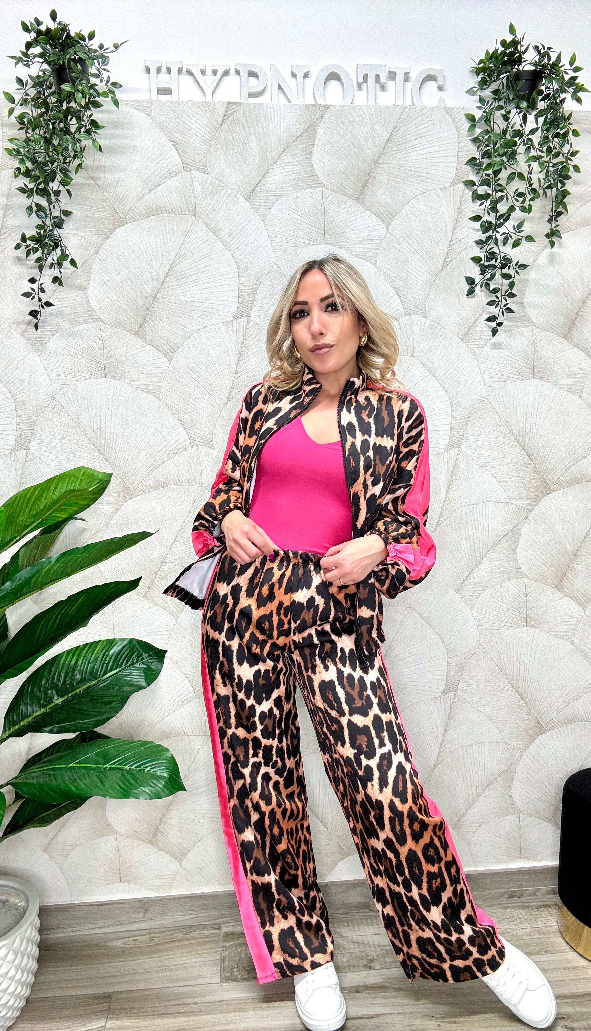Coordinato fantasia Animalier con bande laterali in raso, pantalone modello palazzo con elastico in vita e felpa oversize con zip ed elastico, disponibile in taglia unica con un ottima vestibilita dalla XS alla L. La Modella in foto veste tg. S ed è alta 165 cm.