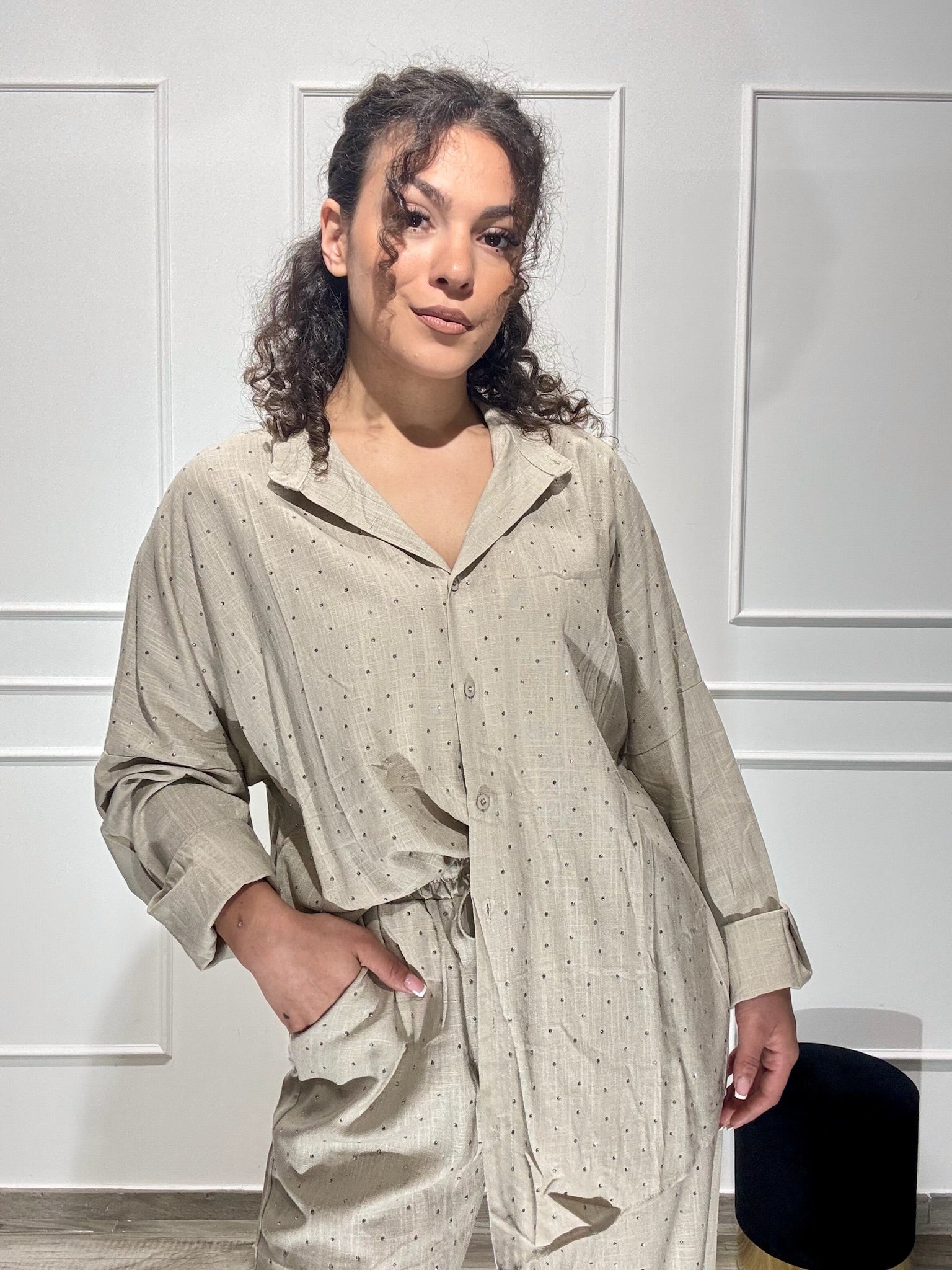 Coordinato in lino composto da camicia modello over e pantalone con elastico e coulisse in vita, punti luce sul davanti.
