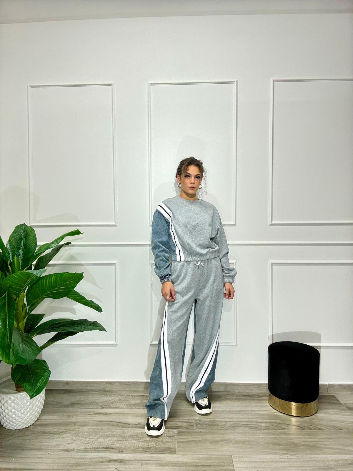 Coordinato tuta modello oversize in cotone garzato, doppio tessuto, felpa e denim, elastico in vita, disponibile in taglia unica ma con un ottima vestibilità fino alla XL. La modella in foto veste tg. Xs ed è alta 160 cm.