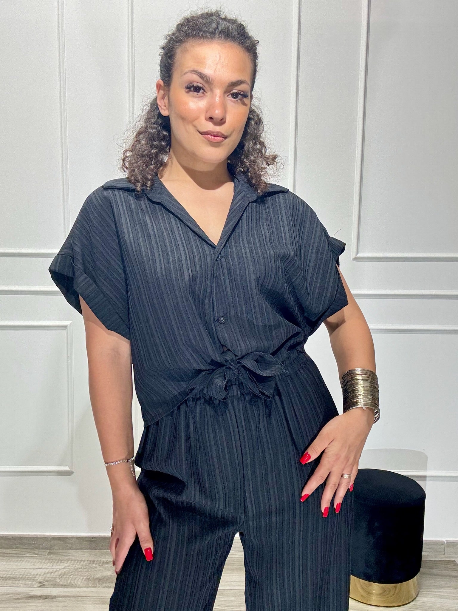Coordinato composto da pantalone palazzo con elastico in vita e camicia con nodo
