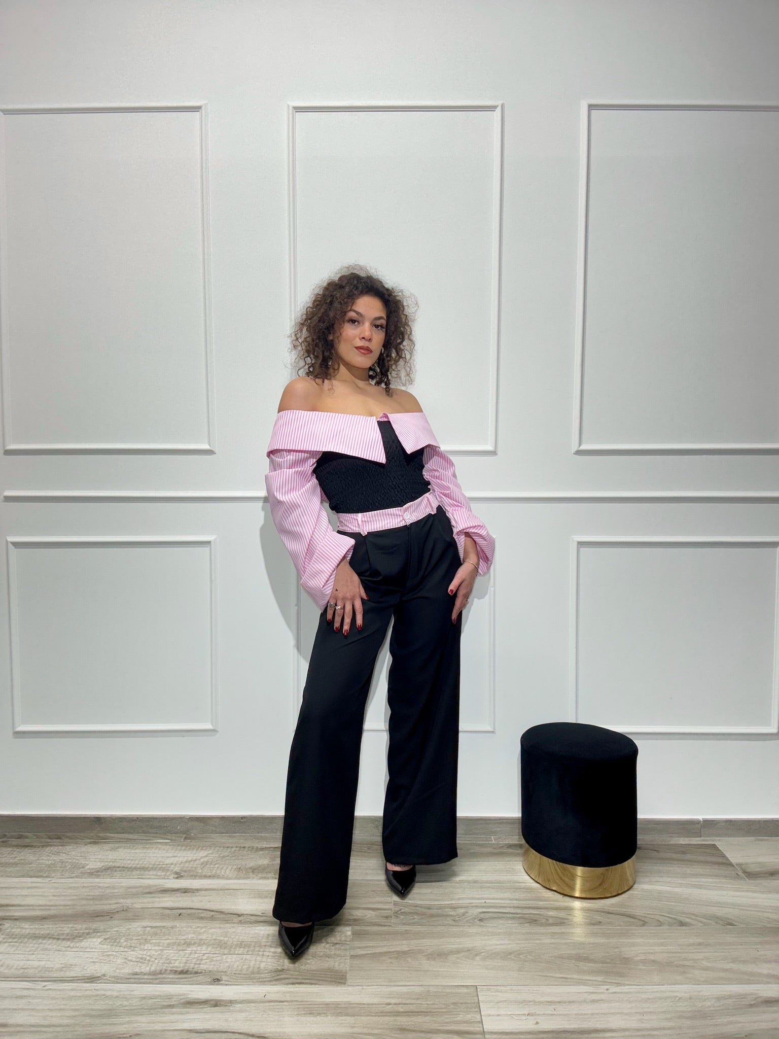 Coordinato Pantalone palazzo e camicia top crop a molla con maniche larghe e drappeggiate rigate.