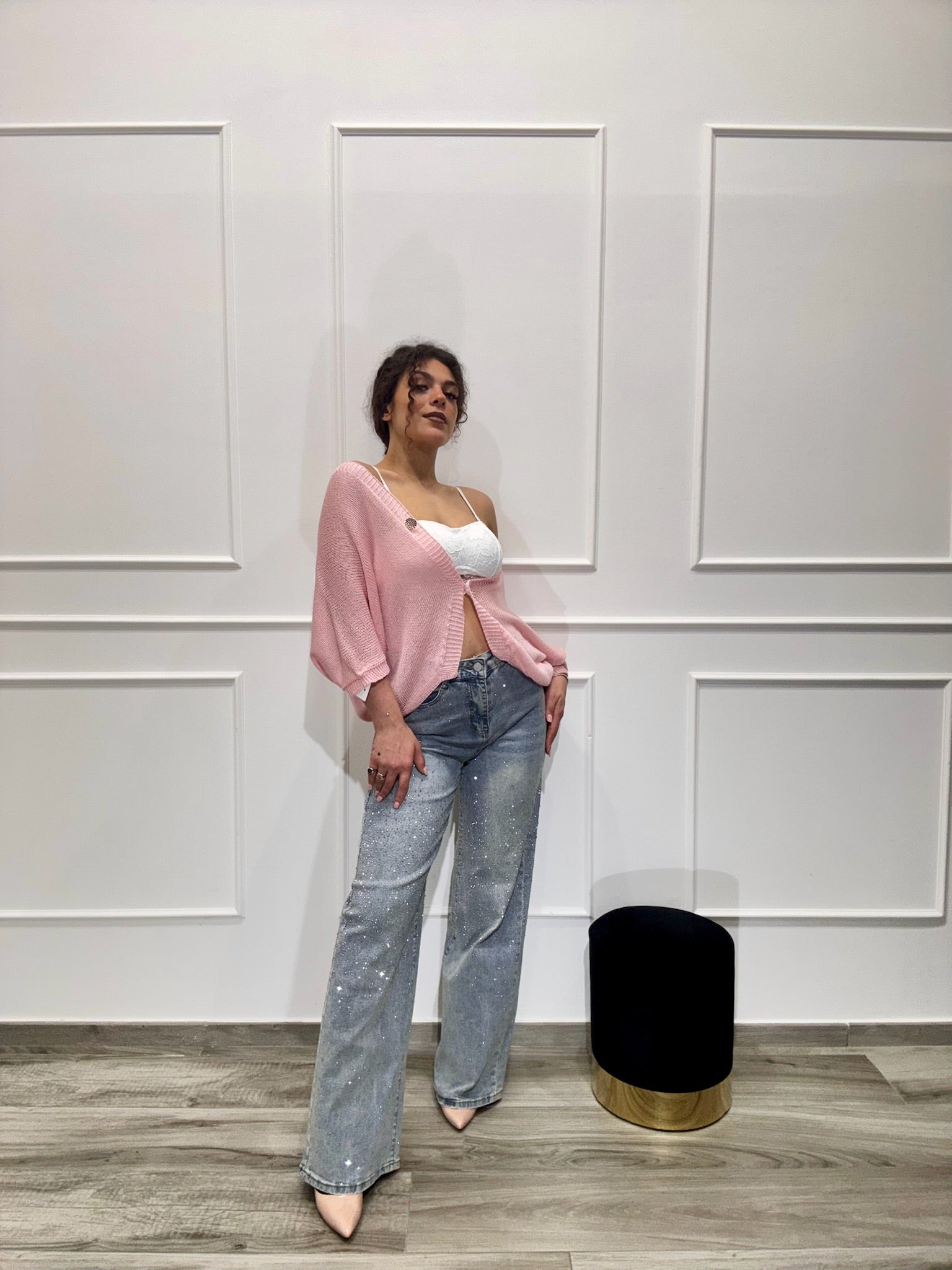 Jeans modello palazzo ricoperto di brillantini, tessuto elastico