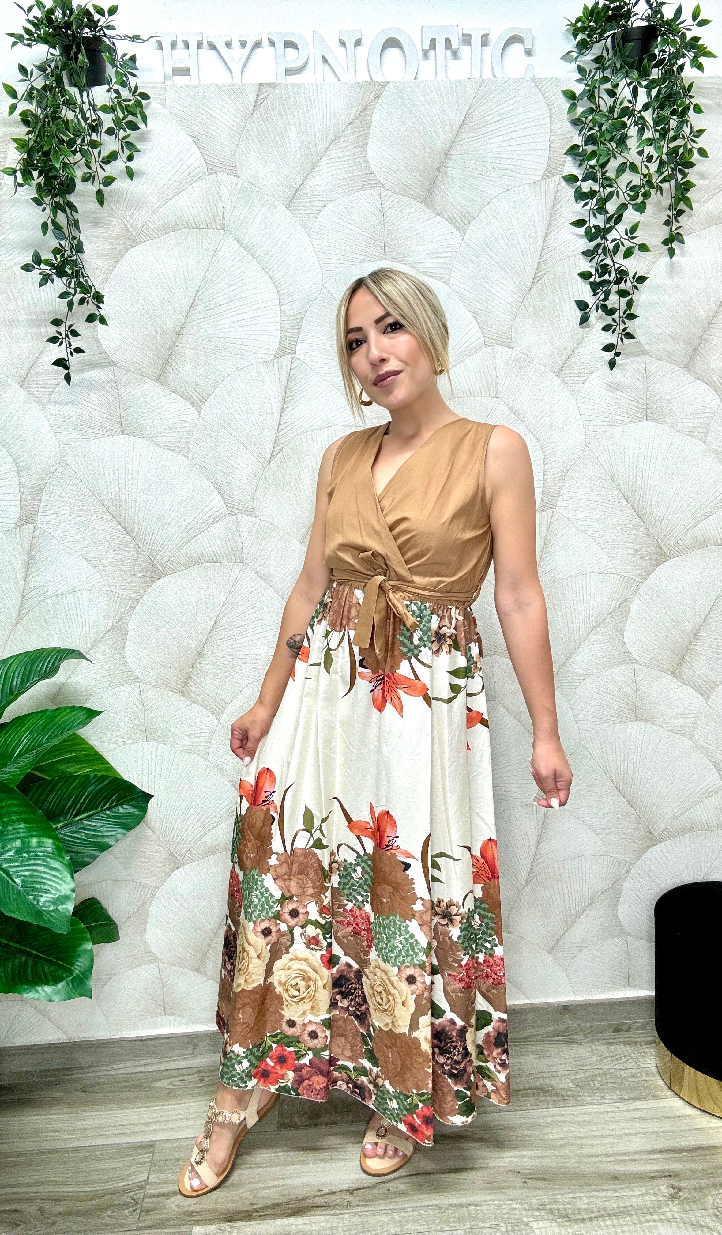Vestito 100% cotone lunghezza midi con scollo a incrocio, fantasia floreale dai toni caldi, elastico in vita e cintura rimovibile. Disponibile in taglia unica ma con un ottima vestibilità dalla XS alla XL. La modella in foto veste tg. S ed è alta 165 cm.