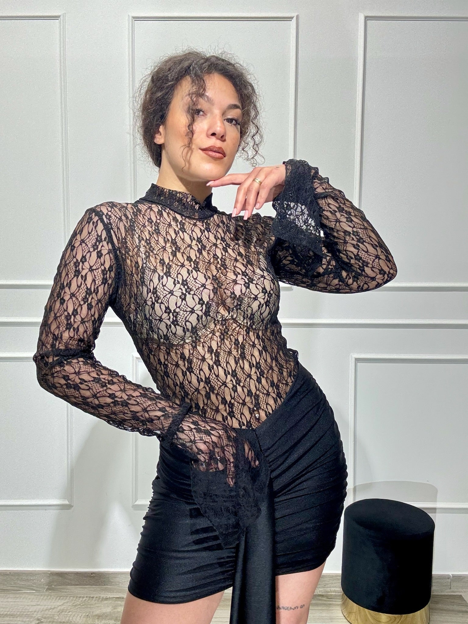 Abito in pizzo e licra deeppeggiato con fusciacca sul davanti e chiusura sul retro, tessuto elastico.
