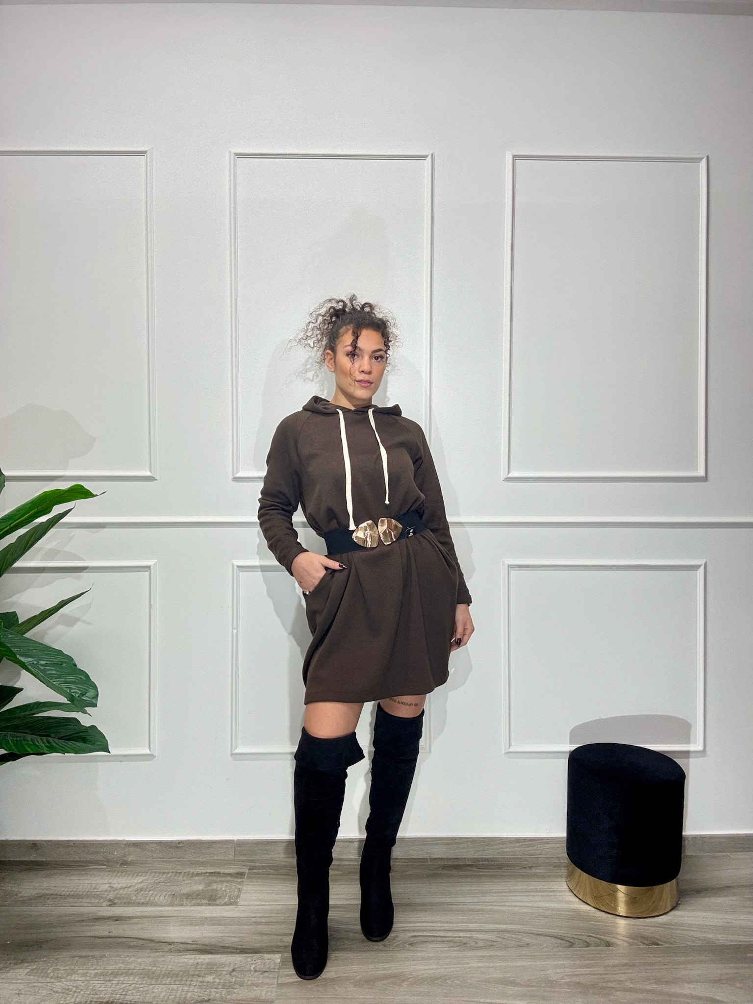 Abito in viscosa, con cappuccio, modello over size, lunghezza regolare. Taglia unica, vestibilità fino alla XXL. Cintura non inclusa. La modella in foto veste tg. XS