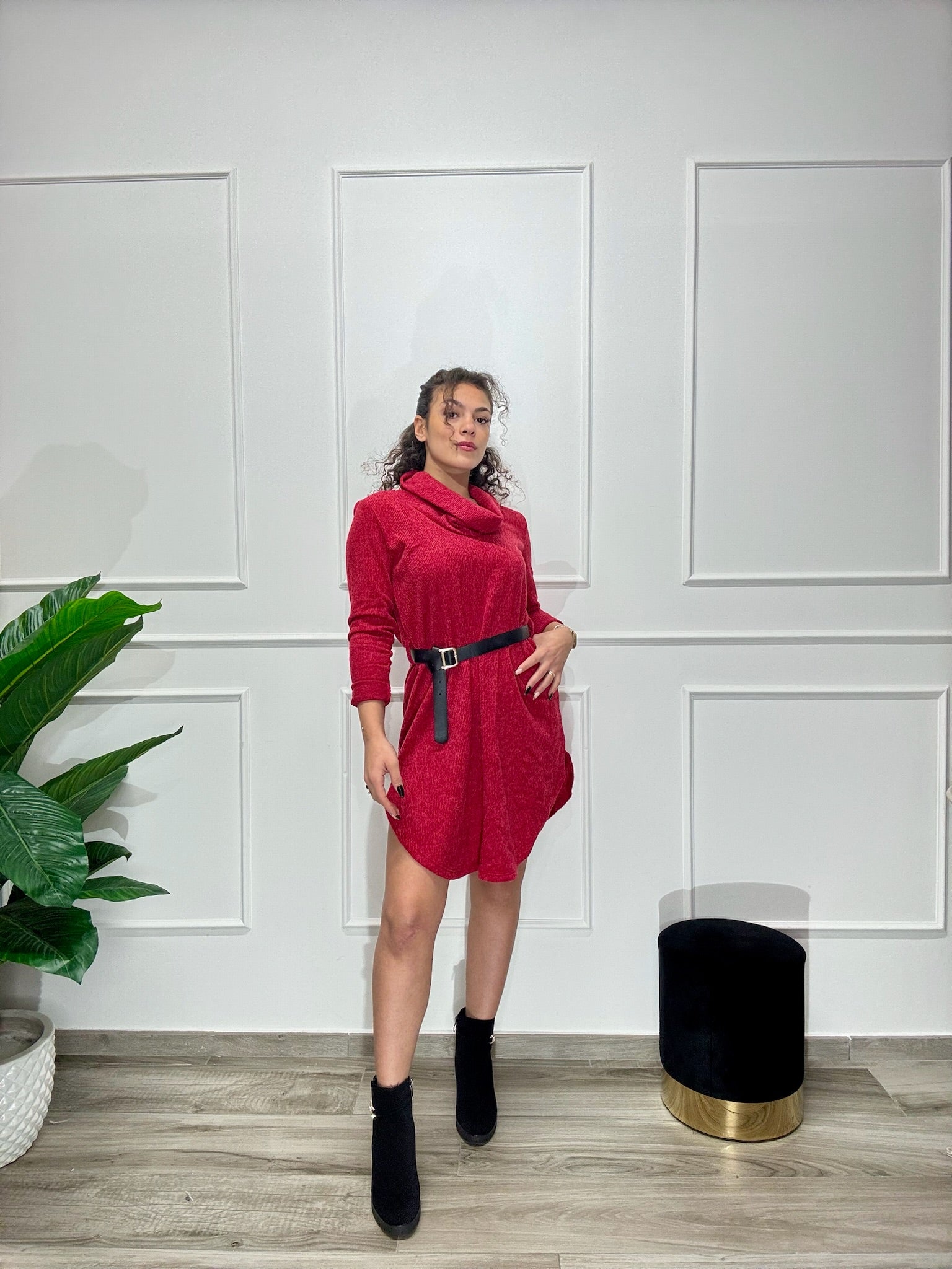 Abito in morbida viscosa con collo ad anello, spacchetto ai lati, cintura inclusa. Disponibile in taglia unica, vestibilità dalla Xs alla XL. La modella in foto veste tg. XS