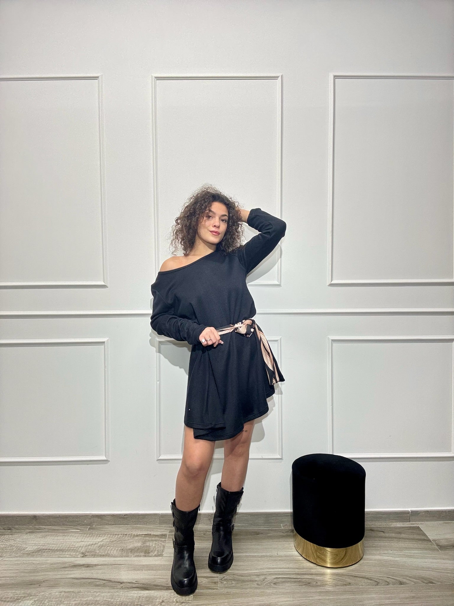 Abito in calda viscosa, svasato. Foulard incluso. Disponibile in taglia unica ma con un ottima vestibilità fino alla XXL. La modella in foto veste tg. XS