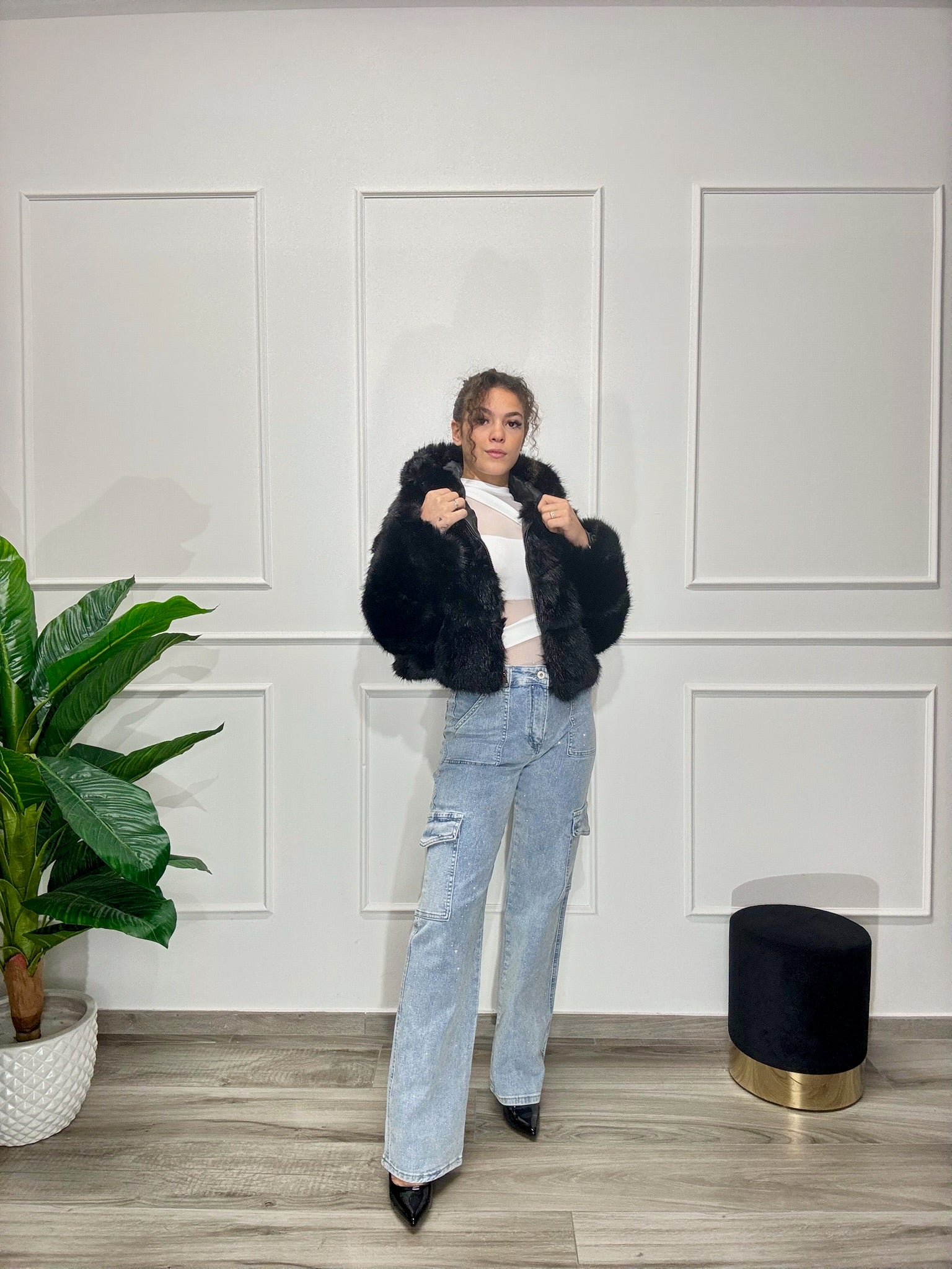 Eco pelliccia pelo lungo modello giubbino con cappuccio e zip sul davanti. Disponibile in taglia unica ma con un ottima vestibilità dalla XS alla XL. La modella in foto veste tg. XS