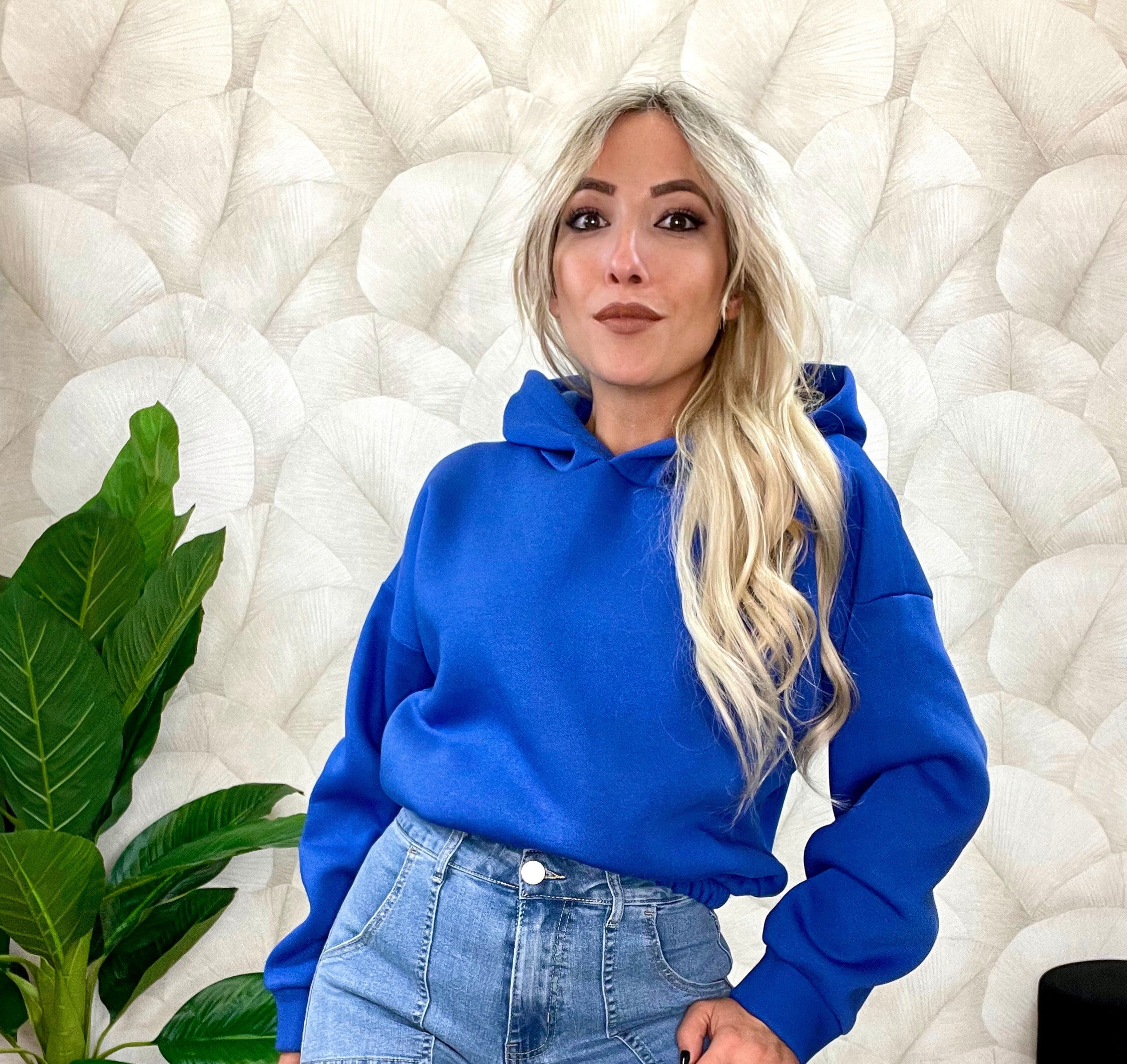 Felpa dalle linee modernissime con una generosa imbottitura, elastico in vita e taglia unica per una vestibilità adatta da XS a XL. La modella in foto veste una taglia S.