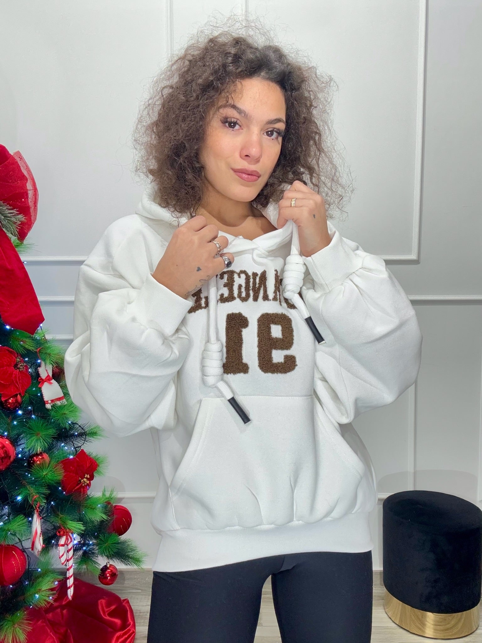 Felpa maxi imbottitura felpata all’interno, con scritta in tessuto sul davanti, leggermente più lunga sul retro. Disponibile in taglia unica ma con un ottima vestibilità dalla XS alla XL. La modella in foto veste tg. XS