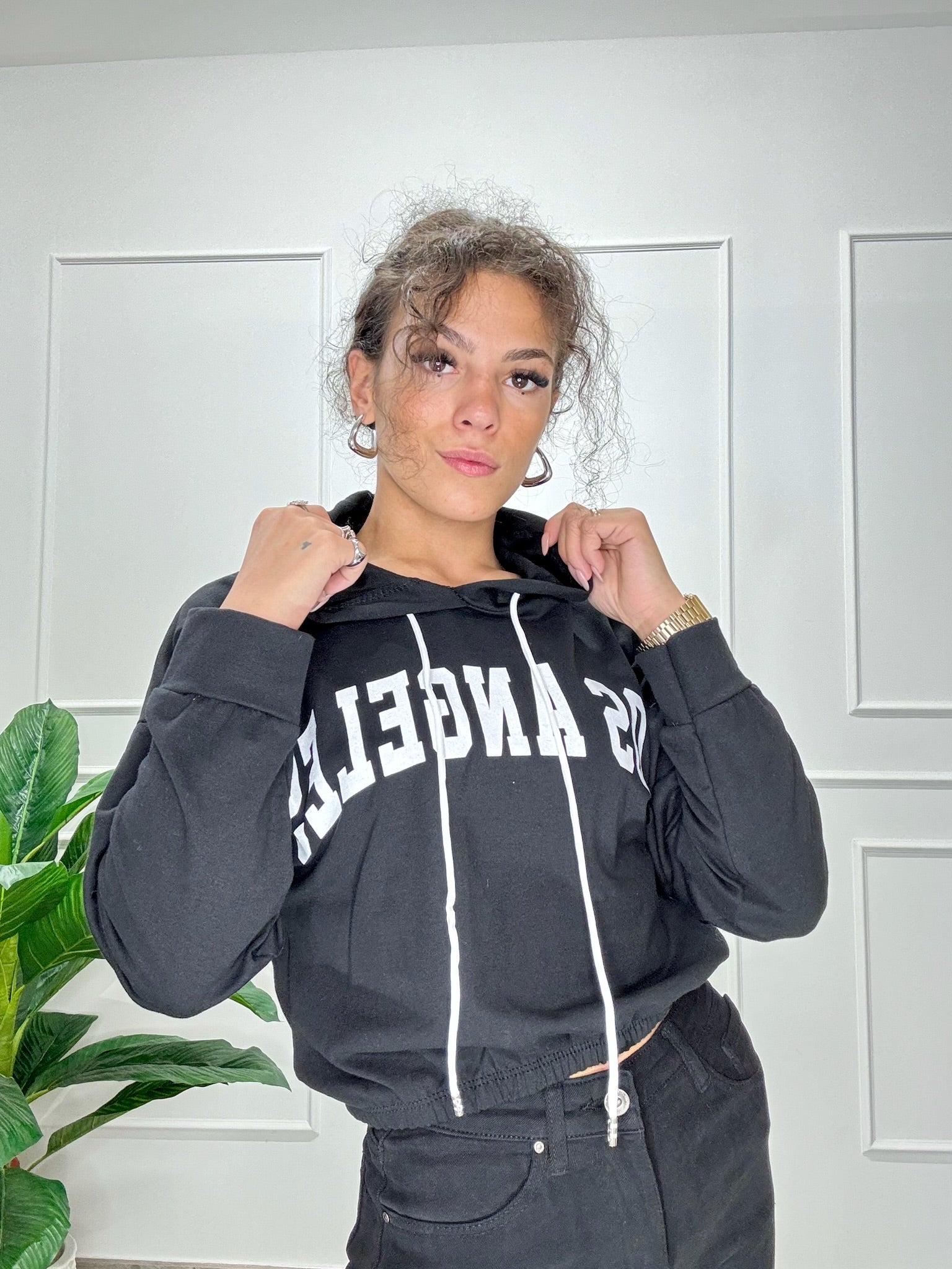 Felpina Crop in cotone con cappuccio e stampa, tessuto elastico. Disponibile in taglia unica ma con un ottima vestibilità dalla XS alla L. La modella in foto veste tg. XS