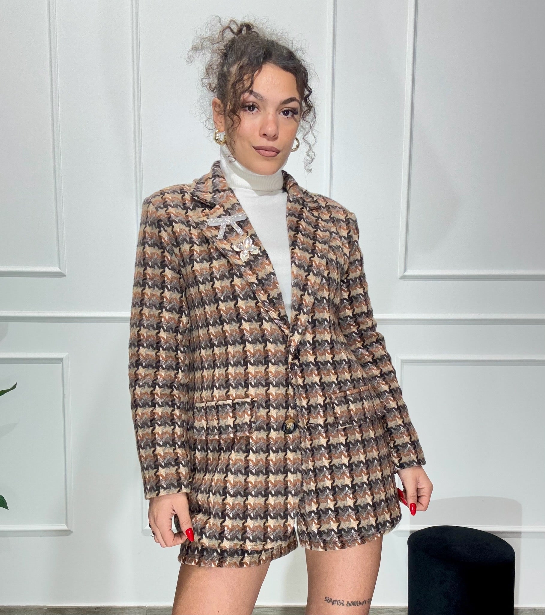 Giacca foderata, in fantasia in misto lana, con spille rimovibili applicate sul rever. Chiusura a due bottoni, disponibile in taglia unica ma con un ottima vestibilità dalla XS alla L. La modella in foto veste tg. XS