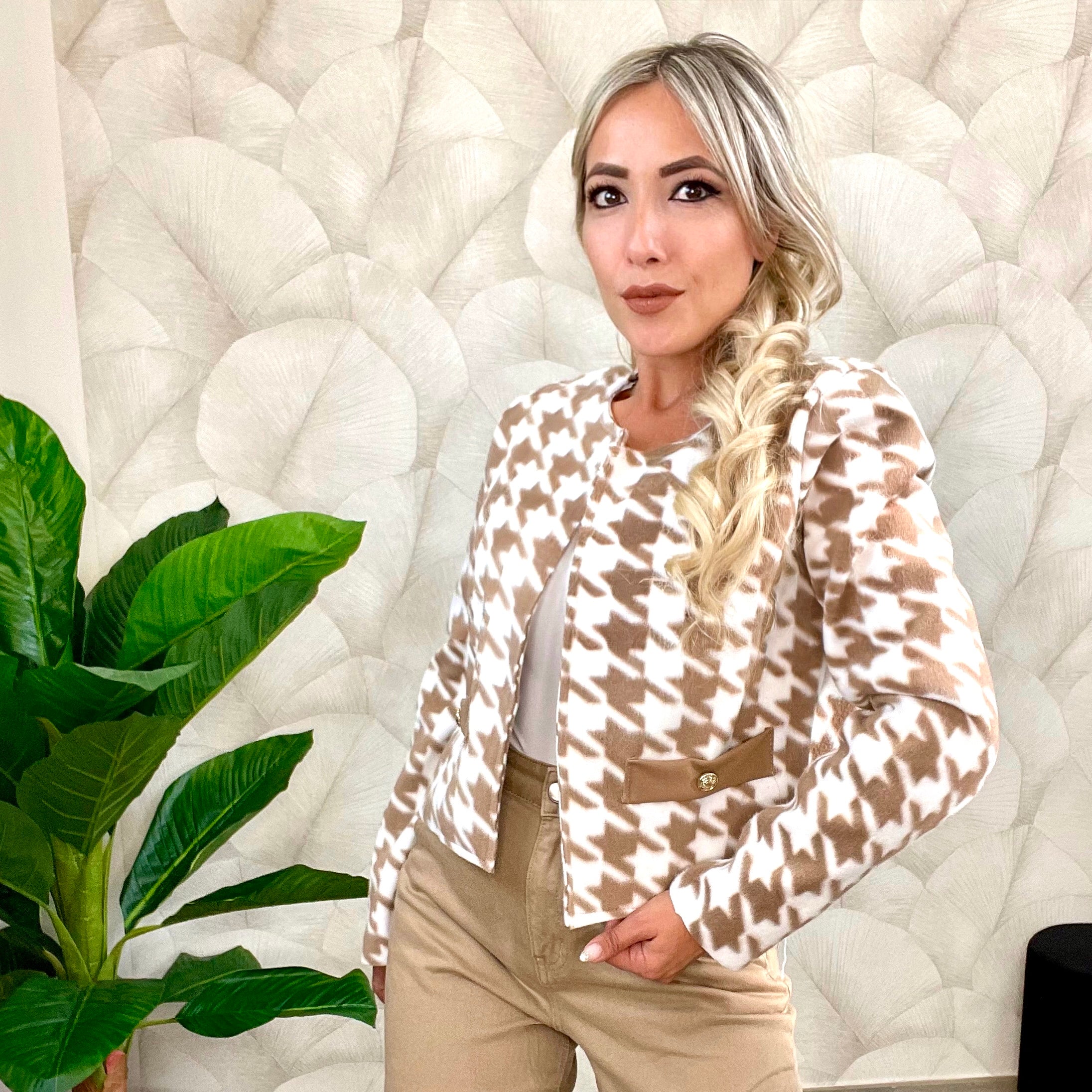 Giacca soft con motivo Pied De Poule in tessuto di panno taglio vivo, finte tasche e un bottoncino dorato. Disponibile in taglia unica, con ottima vestibilità da S fino a XL.