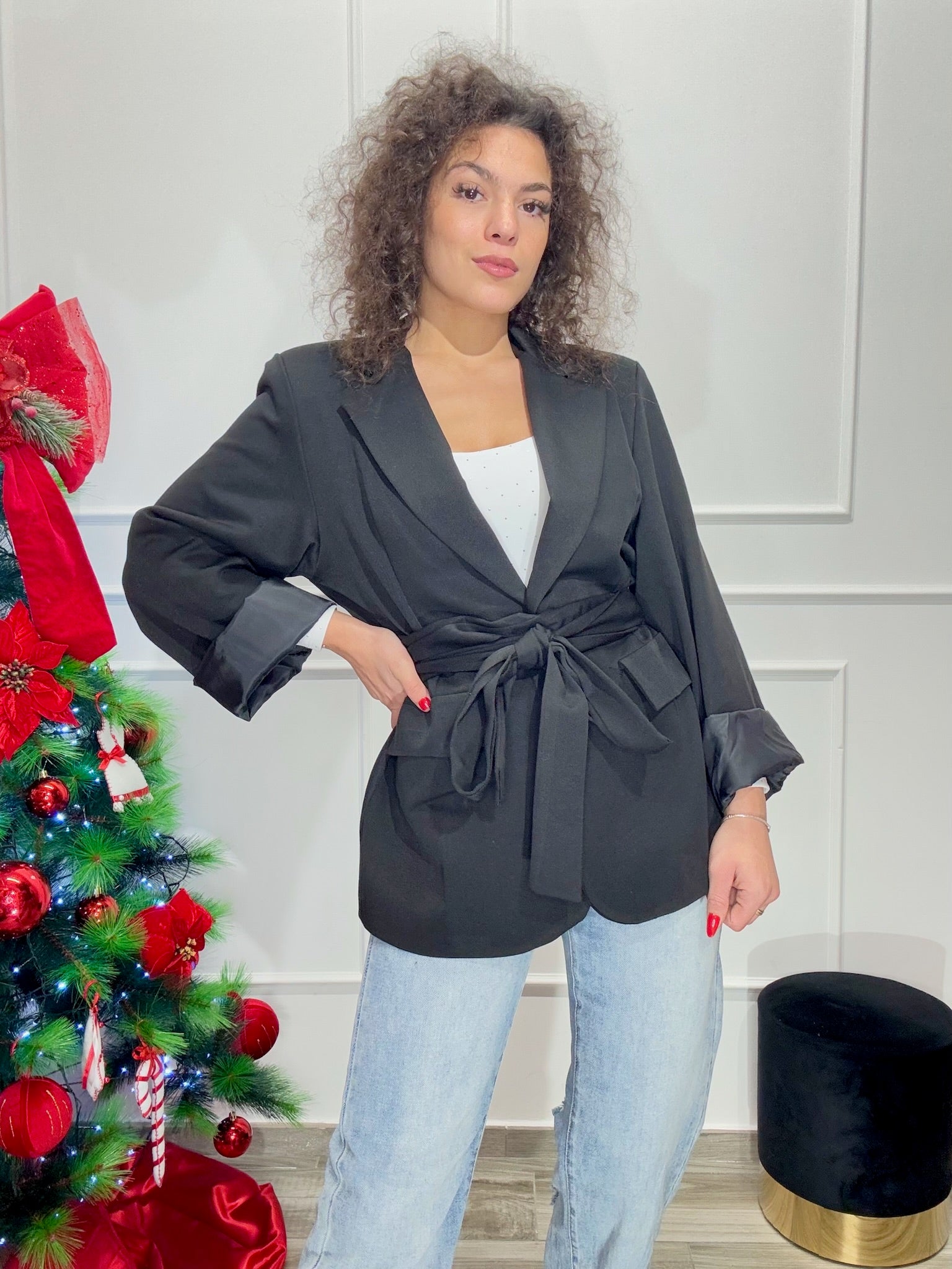 Giacca foderata con bottoni sul davanti e finte tasche, spalline incorporate, cintura annodata rimovibile, taglia unica, vestibilità dalla XS alla L. La modella in foto veste tg. XS