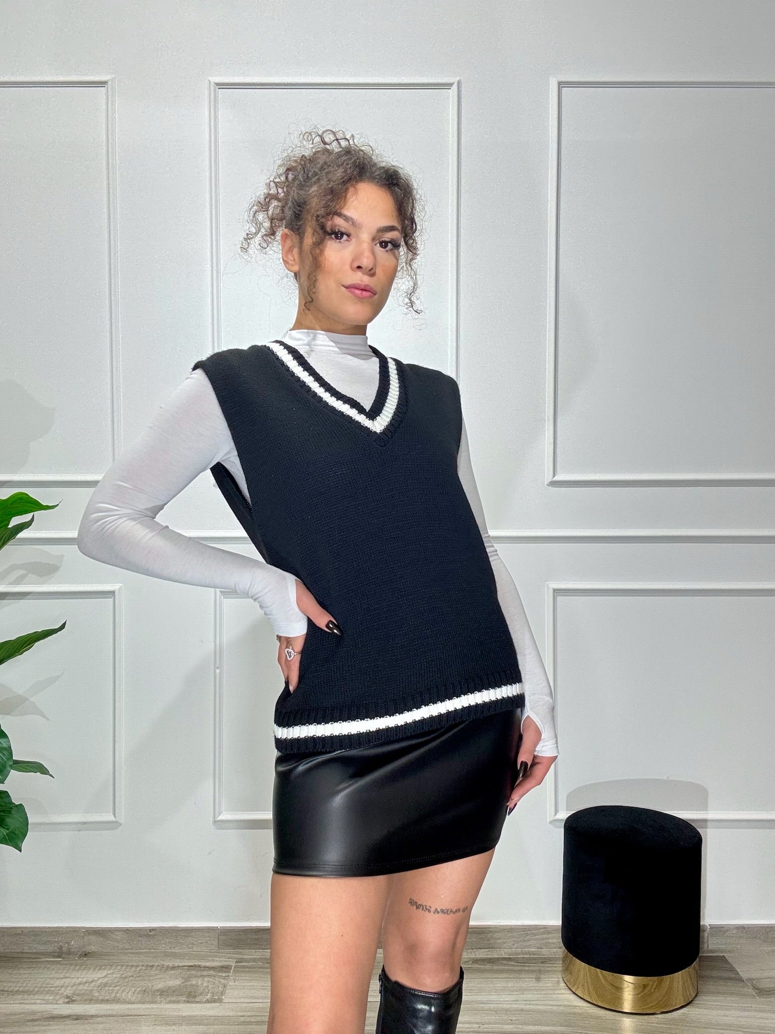 Gilet in lanetta doppio colore con scollo a punta. Disponibile in taglia unica ma con un ottima vestibilità dalla XS alla L. La modella in foto veste tg. XS