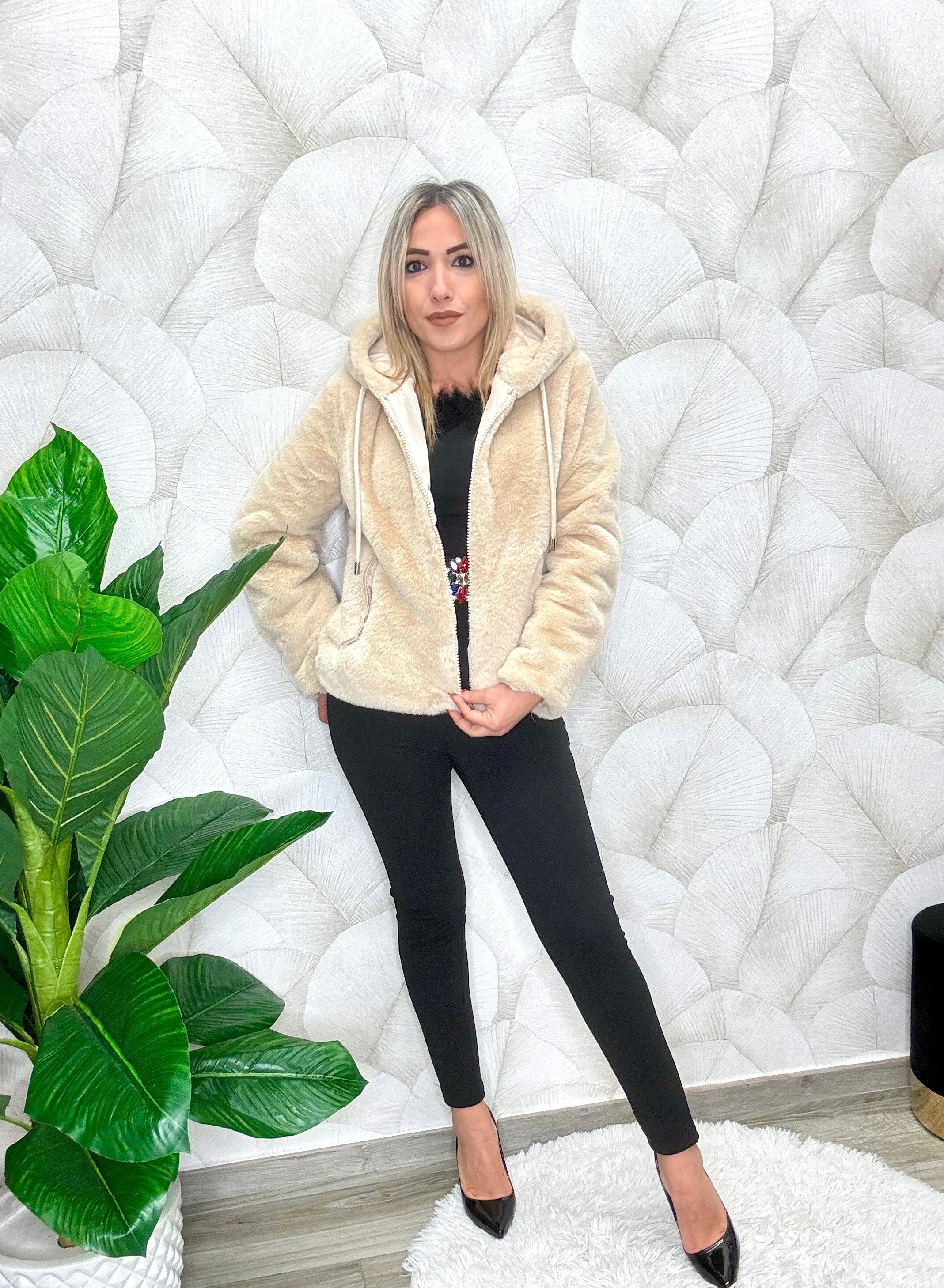 Giubbotto in eco pelliccetta, pelo super morbido, internamente foderato, con cappuccio zip e tasche. Vestibilità regolare, disponibile dalla S alla XL. La modella in foto indossa taglia S ed è alta 165 cm.