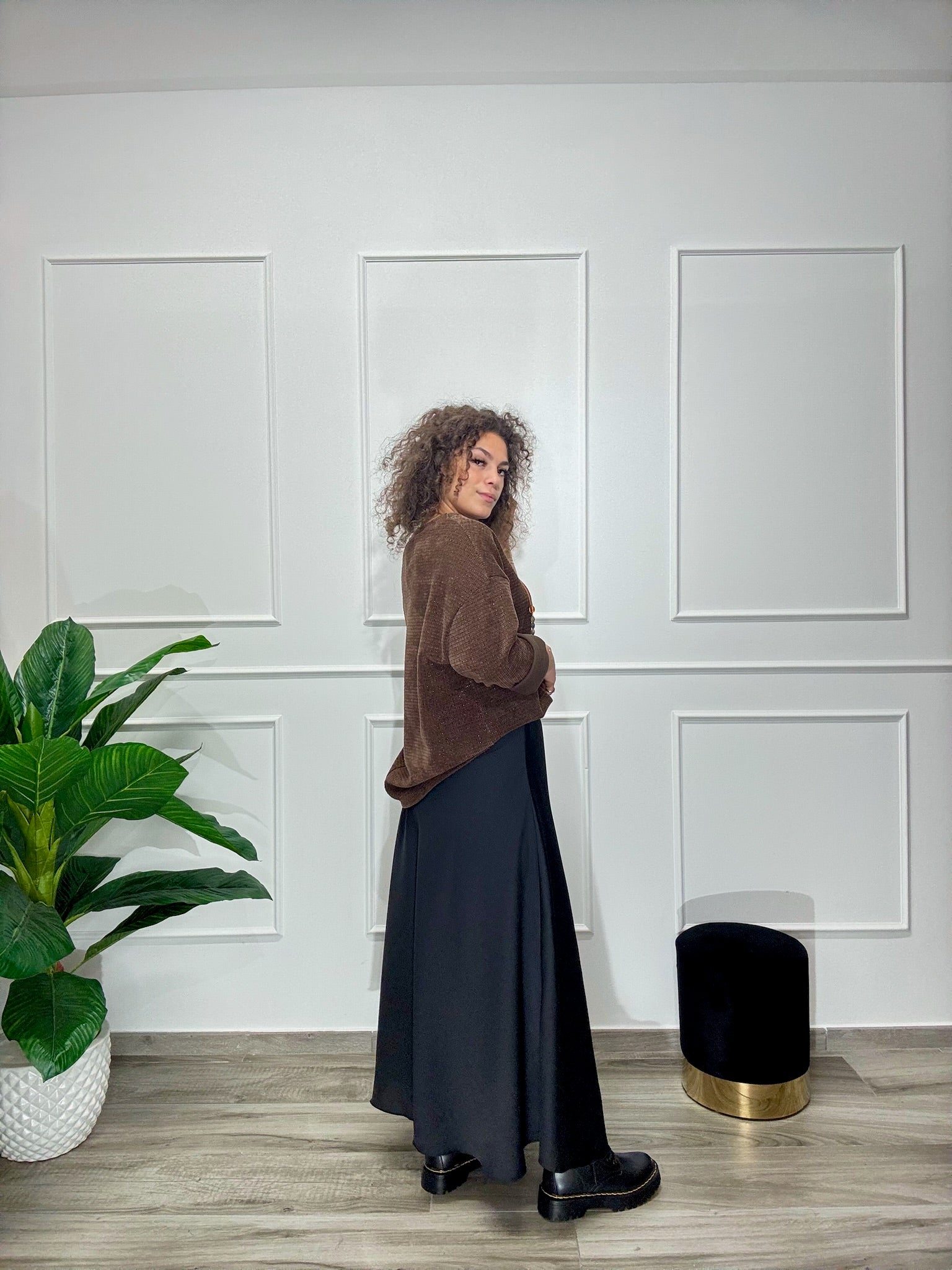 Gonna lunghezza Midi in raso con elastico in vita, disponibile in taglia unica ma con un ottima vestibilità dalla XS alla L. La modella in foto veste tg. XS ed è alta 160 cm.