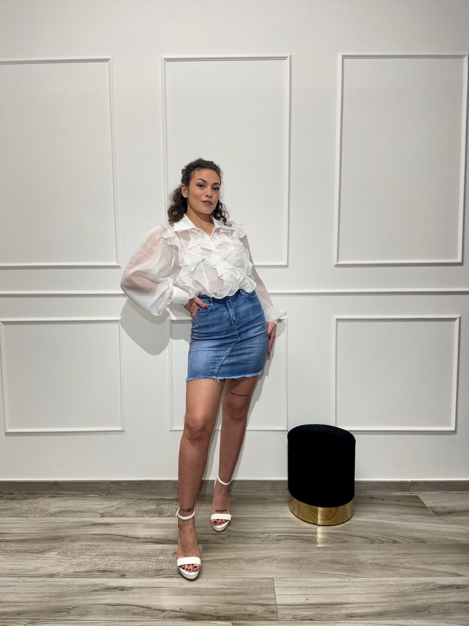 Gonna in denim, lunghezza al ginocchio, tessuto elastico con strass.