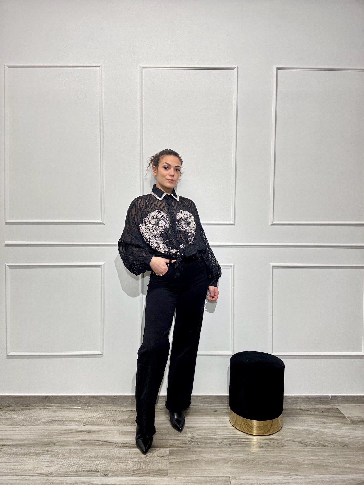 Jeans nero sfrangiato, tessuto elastico, vestibilità regolare. La modella in foto indossa tg. XS