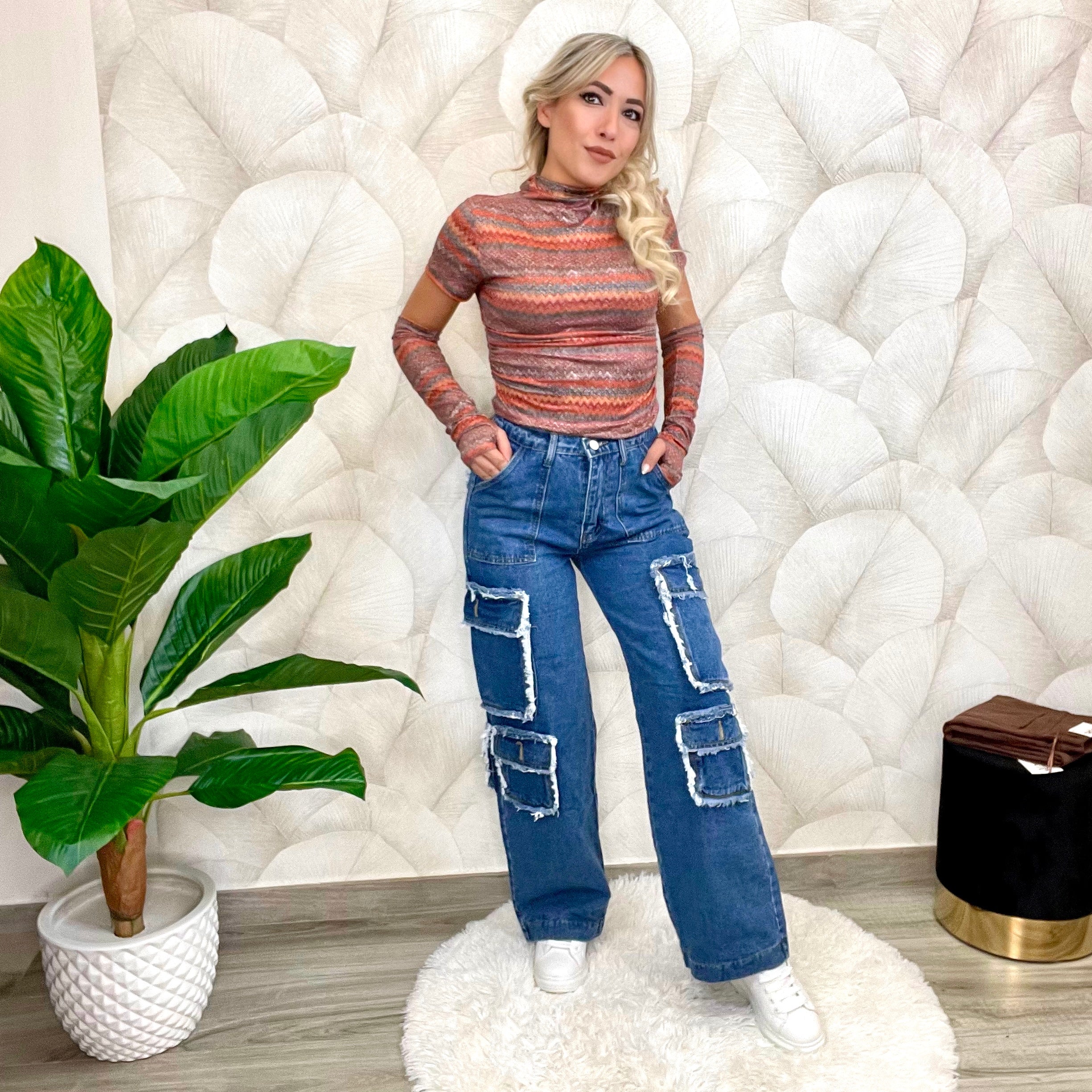Jeans Manhattan dal design cargo con pratiche tasche sfrangiate ed elastico in vita. Tessuto resistente, non elastico.