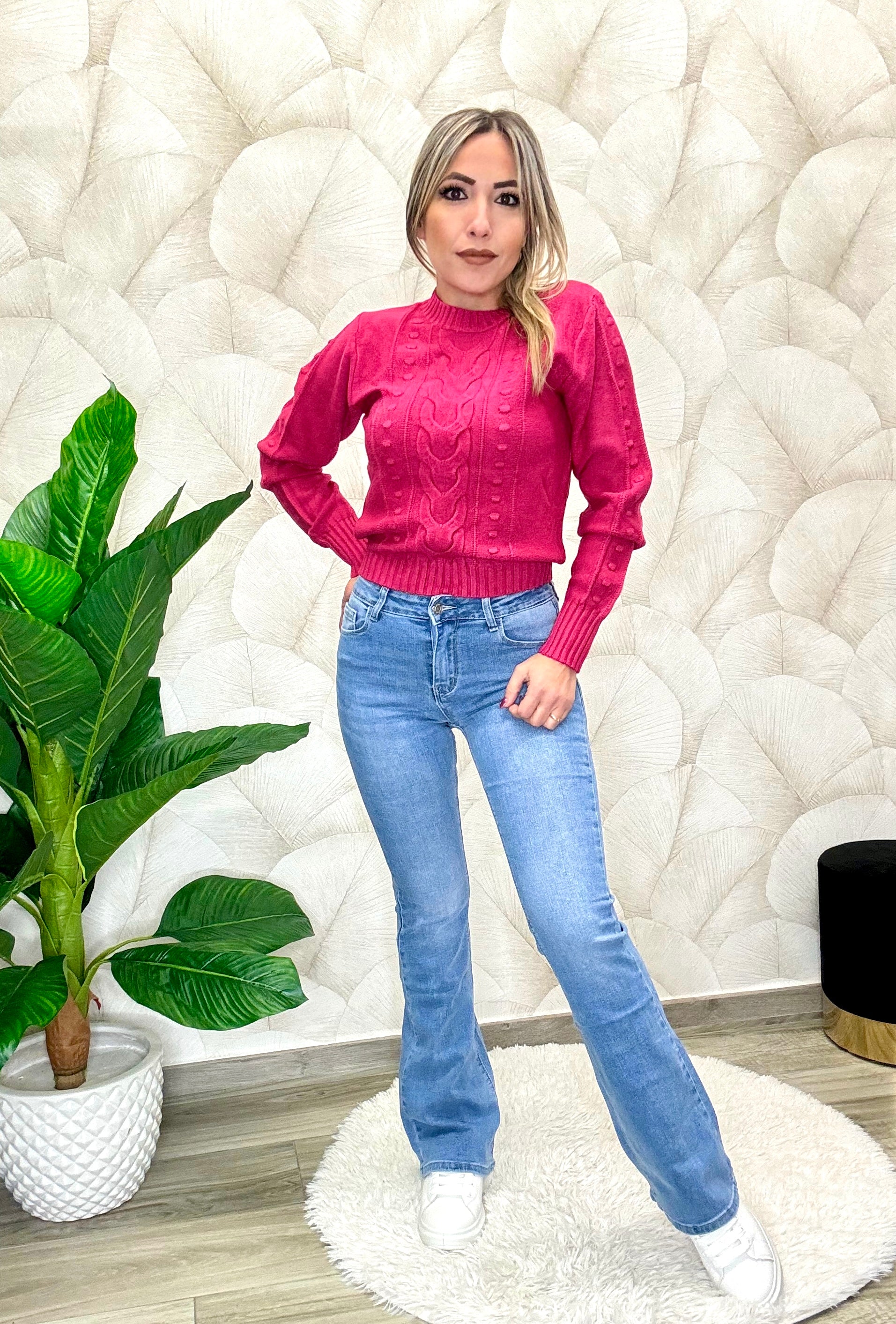 Jeans modello a zampa effetto push up, tessuto elastico. La modella indossa tg S ed è alta 165 cm.