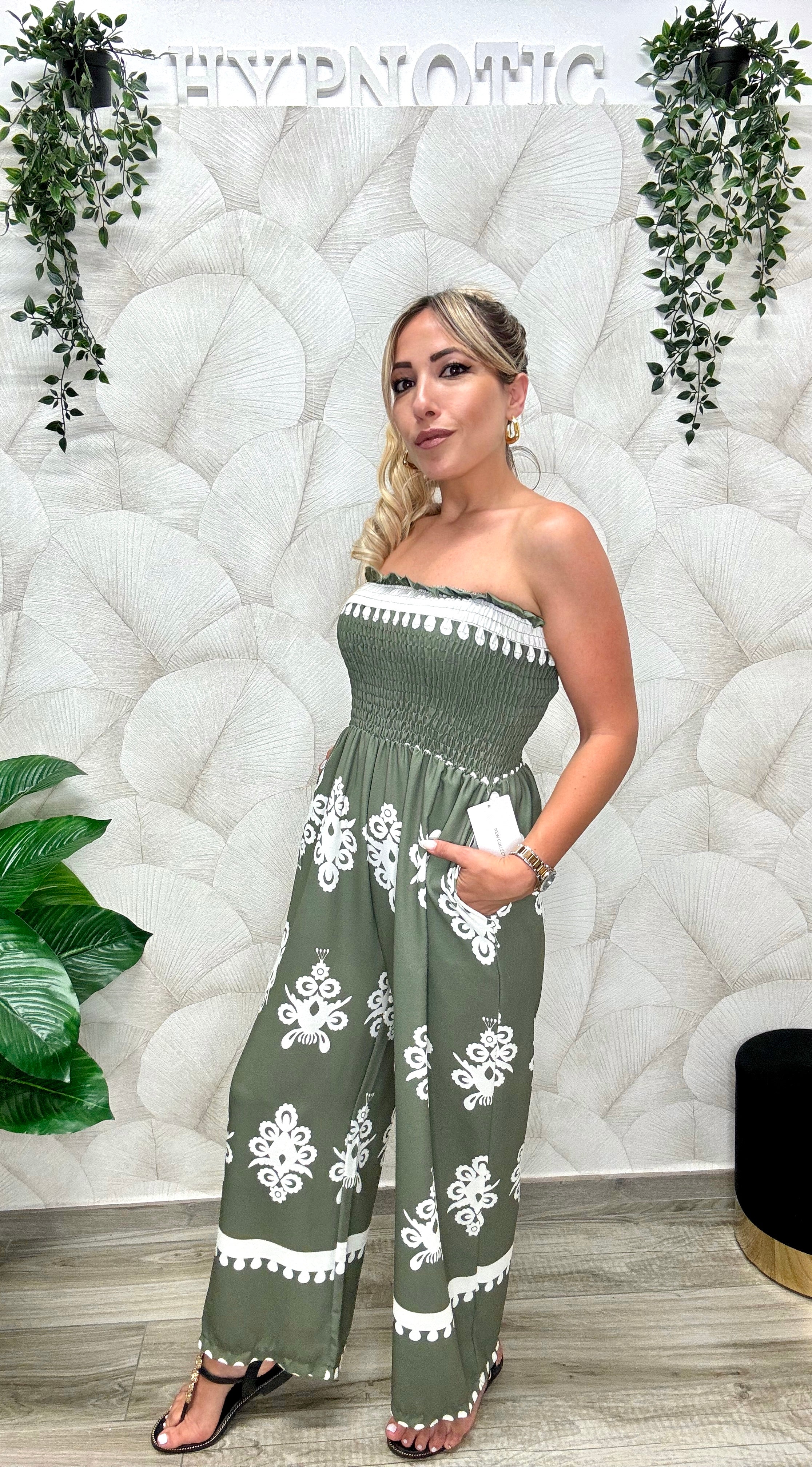 Tuta intera a fascia elastica, modello palazzo. Disponibile in taglia unica, con un ottima vestibilità dalla XS alla XL. La modella in foto veste tg. S ed è alta 165 cm.